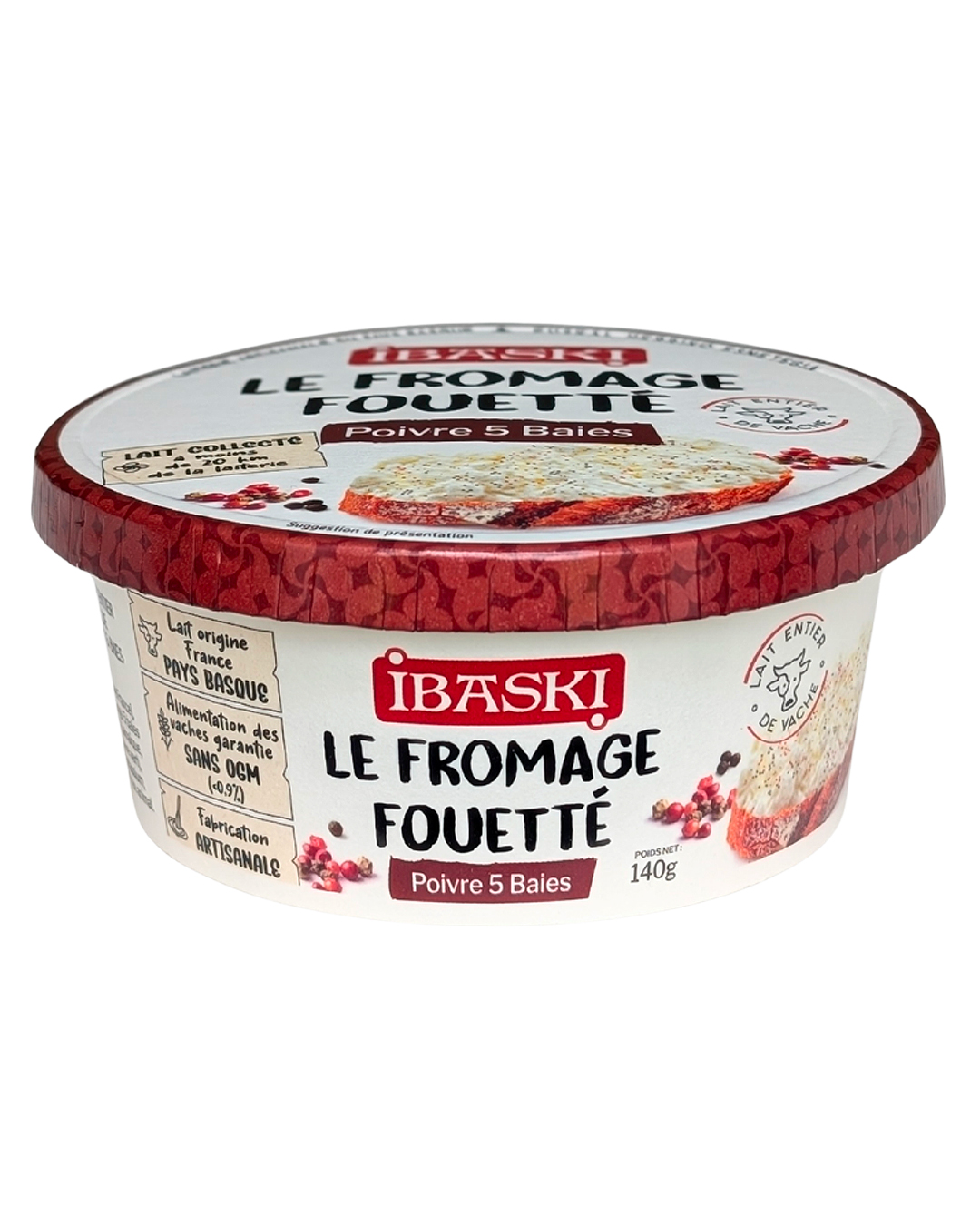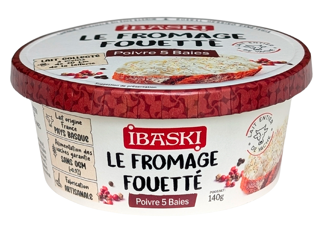 Ibaski, marque de la laiterie basque Bastidarra, propose une variation autour de son fromage fouetté avec une recette aux cinq baies qui apporte une touche épicée tout en restant douce.