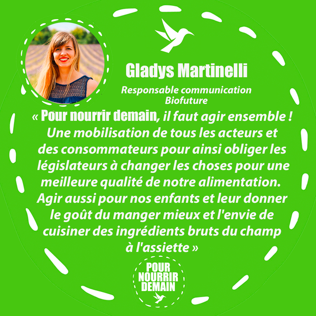 « Pour nourrir demain il faut agir ensemble ! Une mobilisation de tous les acteurs et des consommateurs pour ainsi obliger les législateurs à changer les choses pour une meilleure qualité de notre alimentation ((transparence alimentaire, limitation voir une suppression totale des pesticides, meilleur accompagnement des agriculteurs en transition bio…). Agir aussi pour nos enfants et leur donner le goût du manger mieux et l’envie de cuisiner des ingrédients bruts du champ à l’assiette »