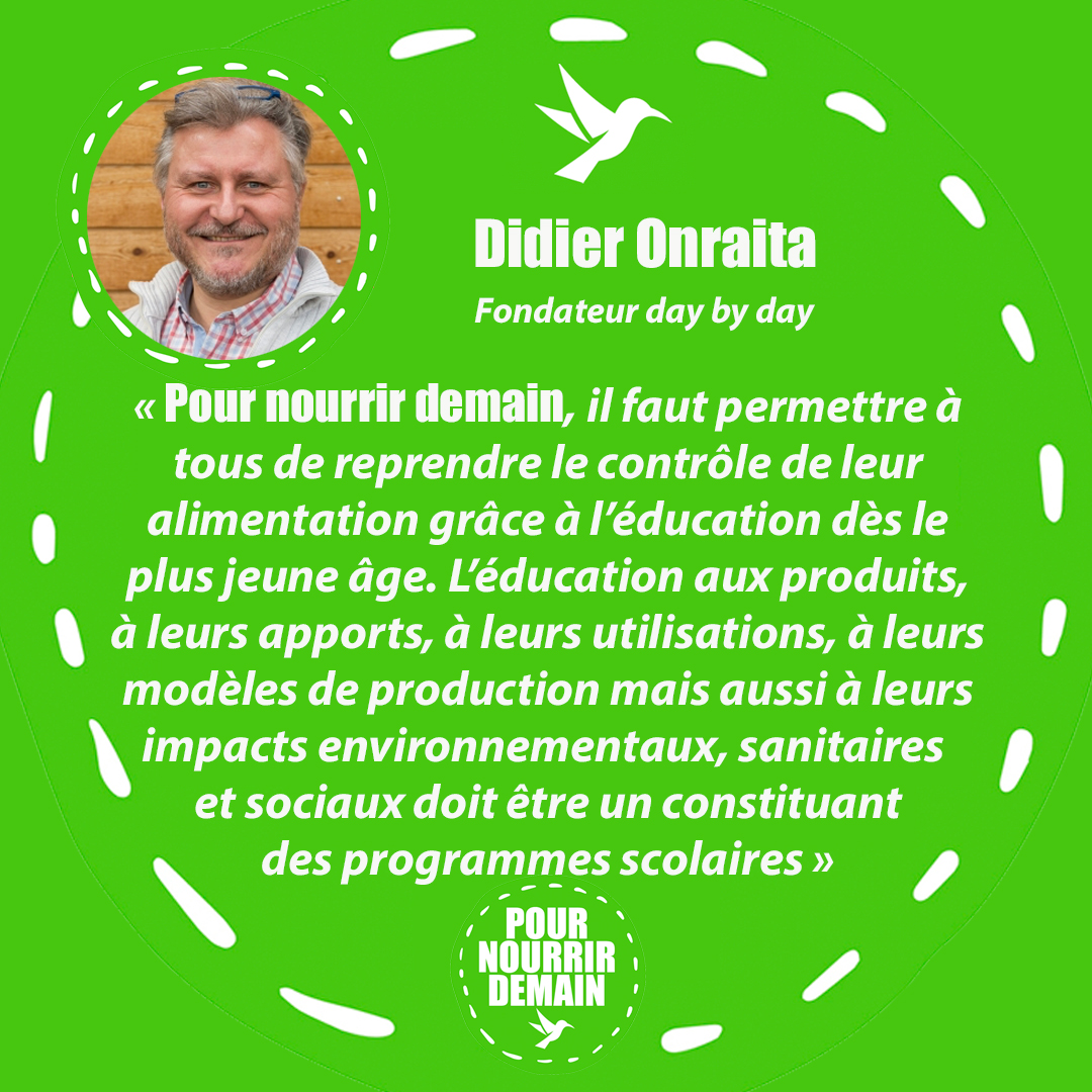 «Pour nourrir demain, il faut permettre à tous de reprendre le contrôle de leur alimentation grâce à l’éducation dès le plus jeune âge. L’éducation aux produits, à leurs apports, à leurs utilisations, à leurs modèles de production mais aussi à leurs impacts environnementaux, sanitaires et sociaux doit être un constituant des programmes scolaires au même titre que les mathématiques ou la maitrise du langage»