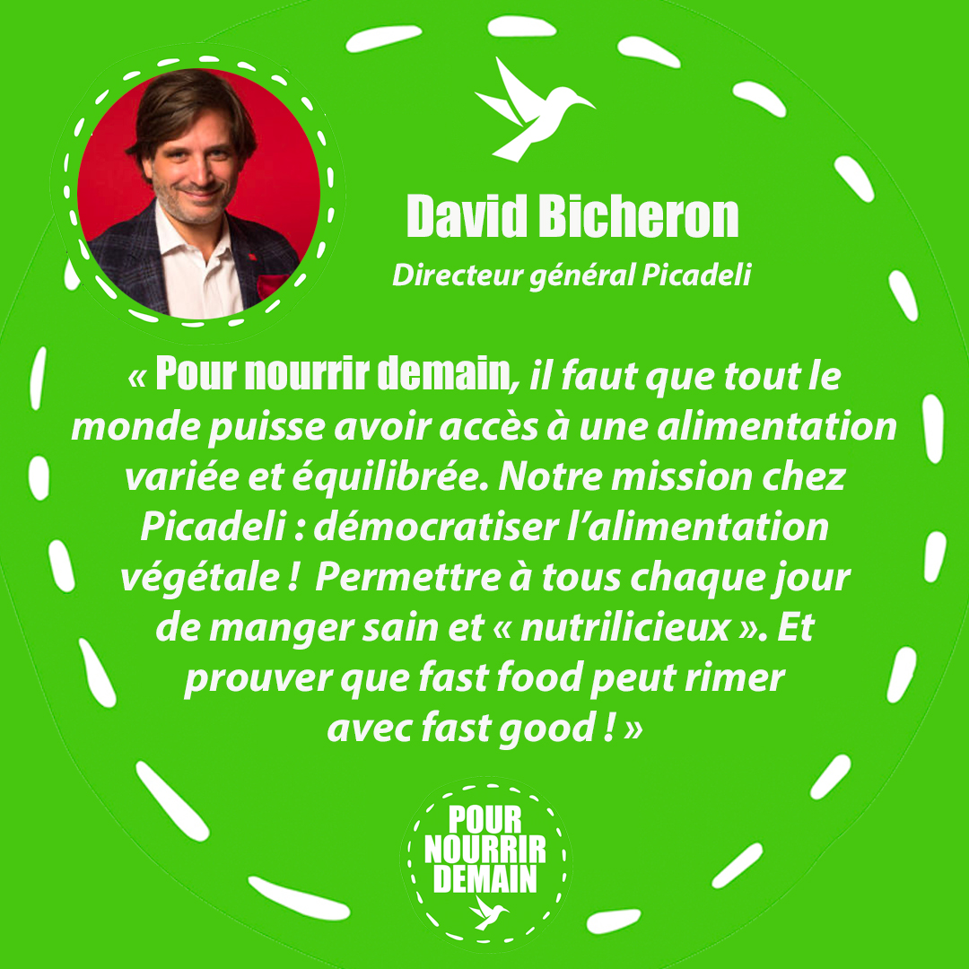 « Pour nourrir demain, il faut que tout le monde puisse avoir accès à une alimentation variée et équilibrée. Notre mission chez Picadeli : démocratiser l’alimentation végétale ! Permettre à tous chaque jour de manger sain et « nutrilicieux ». Et prouver que fast food peut rimer avec fast good. Oui, la restauration rapide peut être équilibrée, fraîche et savoureuse ! »