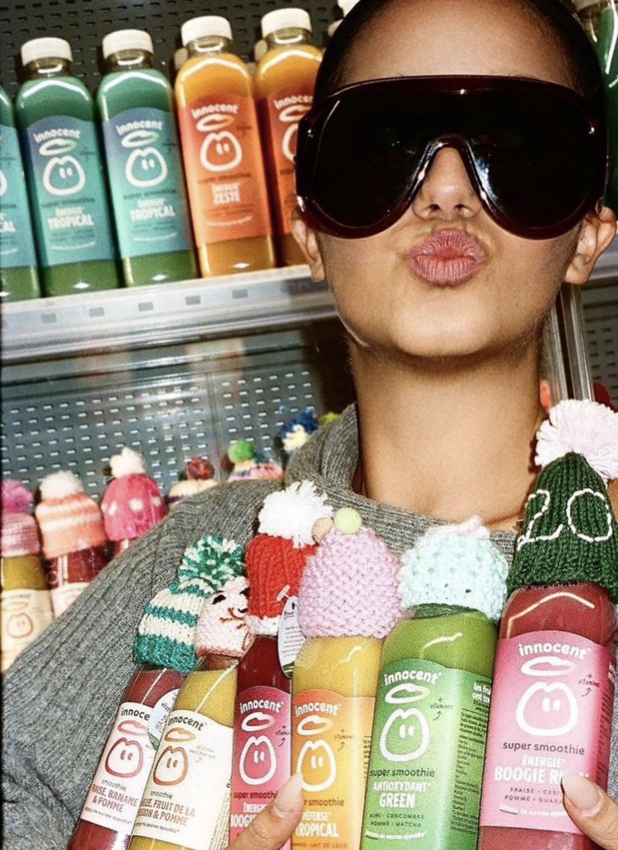 Chaque smoothie coiffé d’un bonnet tricoté participe au financement de repas composés de fruits et légumes pour les personnes âgées isolées.