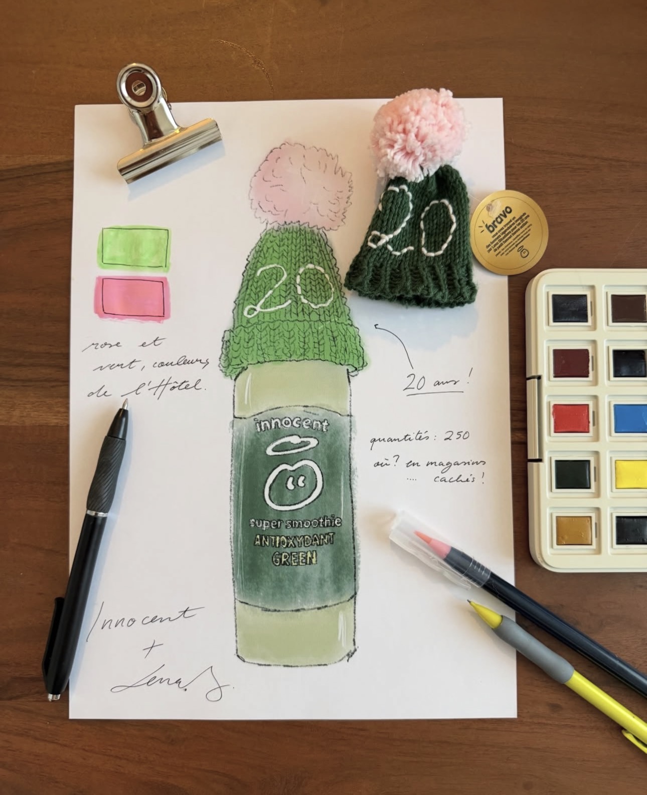 La créatrice de contenus s’est inspirée des souvenirs de son enfance pour imaginer un bonnet rose et vert, à retrouver sur l’une des 250 bouteilles disséminées en rayon snacking partout en France.