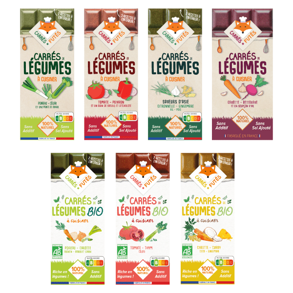 Carrés Futés ce sont des tablettes de légumes à cuisiner et des tablettes de fruits à pâtisser. Les Carrés Futés sont composés d’un concentré de légumes ou de fruits ainsi que d’un peu de beurre de cacao (au goût neutre). Aucun sel ajouté, pas d’huile de palme ni aucun additif, c’est 100% naturel et c’est fabriqué en France !