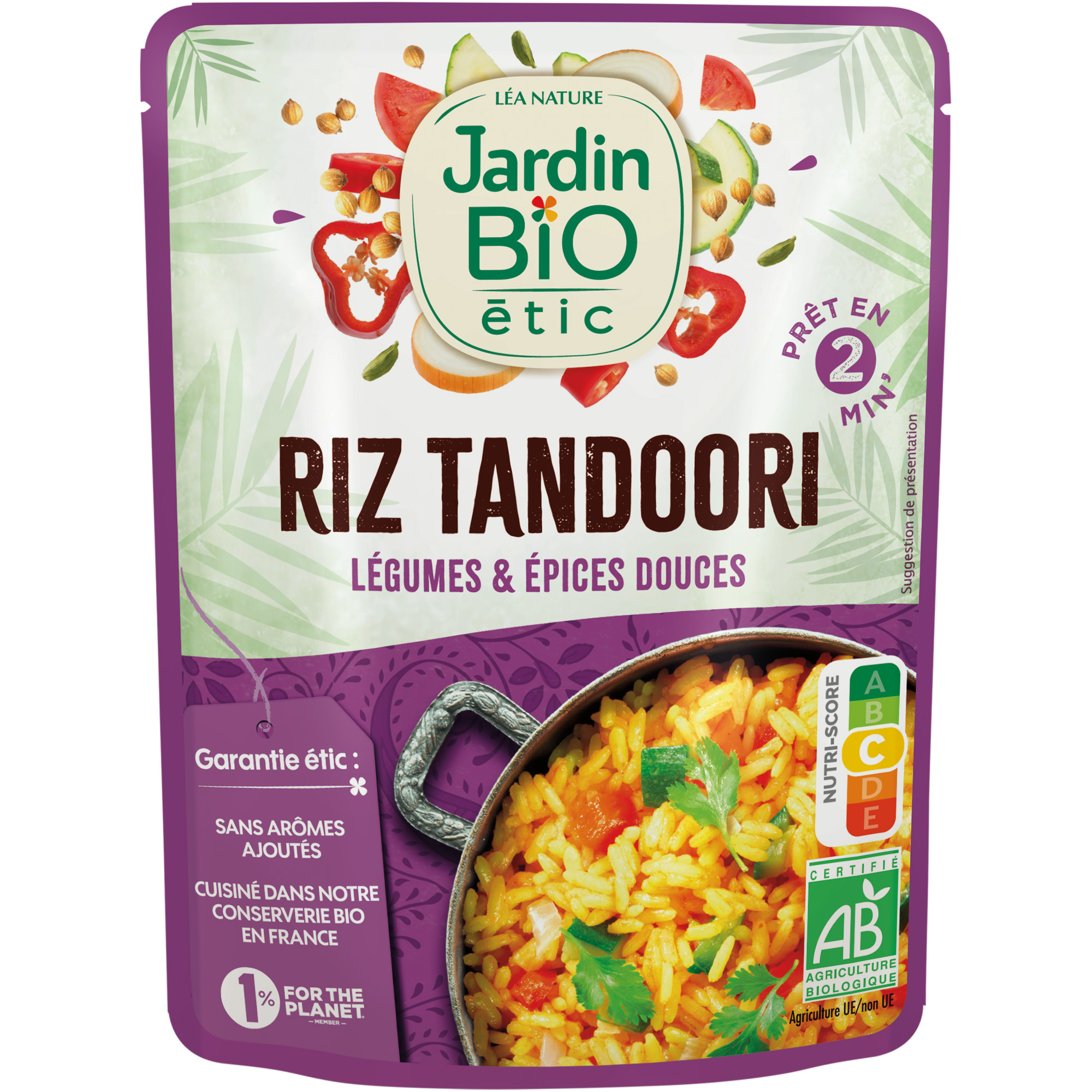 Proposé dans un sachet micro-ondable pratique, Tandoo’Riz est idéal pour une pause déjeuner rapide et savoureuse. Sa recette veggie exotique, agrémentée de légumes bio (poivrons rouges, courgettes, tomates) et d’épices bio, promet une explosion de saveurs en bouche. Sans arômes ajoutés, ce riz incarne l’essence de la cuisine indienne, tout en restant fidèle à l’engagement bio de la marque.