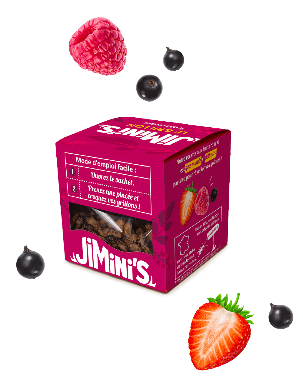 Les grillons aux fruits rouges mêlent framboise, fraise et cassis pour une touche acidulée et délicate. À parsemer sur un yaourt ou une salade de fruits, ils apportent un croustillant inattendu.