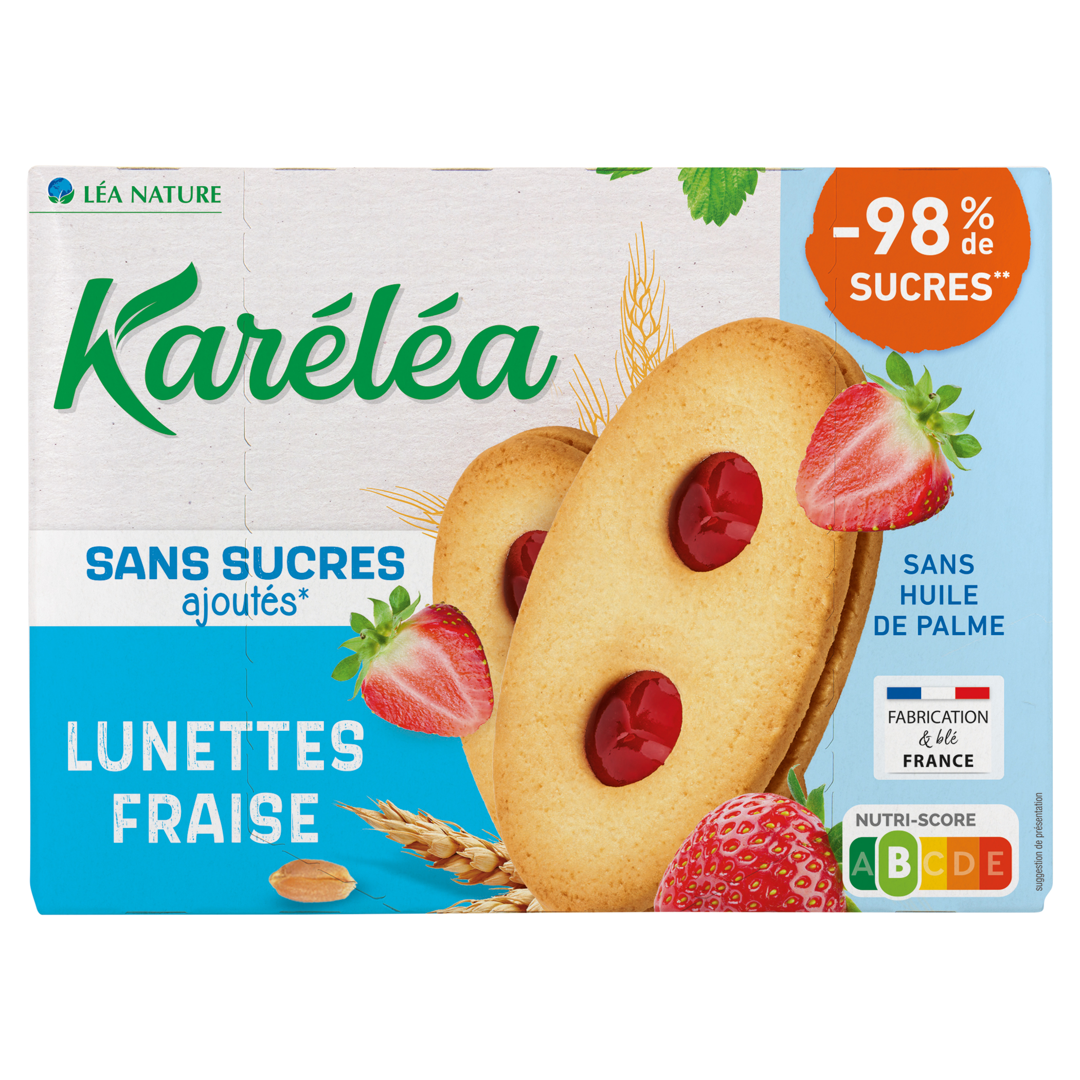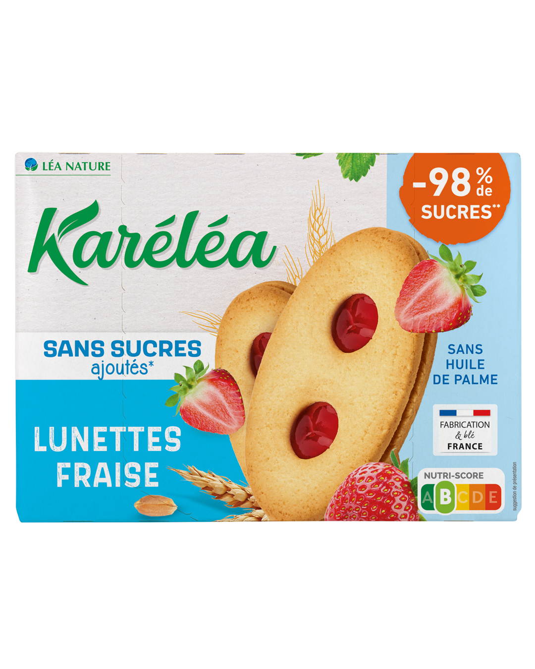 Les fameuses Lunettes, avec leur pâte croquante et leur cœur fondant à la fraise, affichent 98 % de sucres en moins par rapport aux standards du rayon, tout en conservant un Nutriscore B.