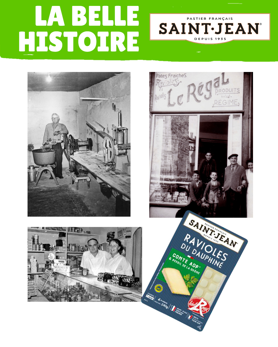 Fin des années 1930 – La rencontre entre Émile Truchet et le détenteur de la recette originelle de Saint-Jean-en-Royans, enrichie de Comté affiné, donne naissance aux ravioles Saint Jean. La finesse de la pâte révèle la farce et sa couleur verte caractéristique.