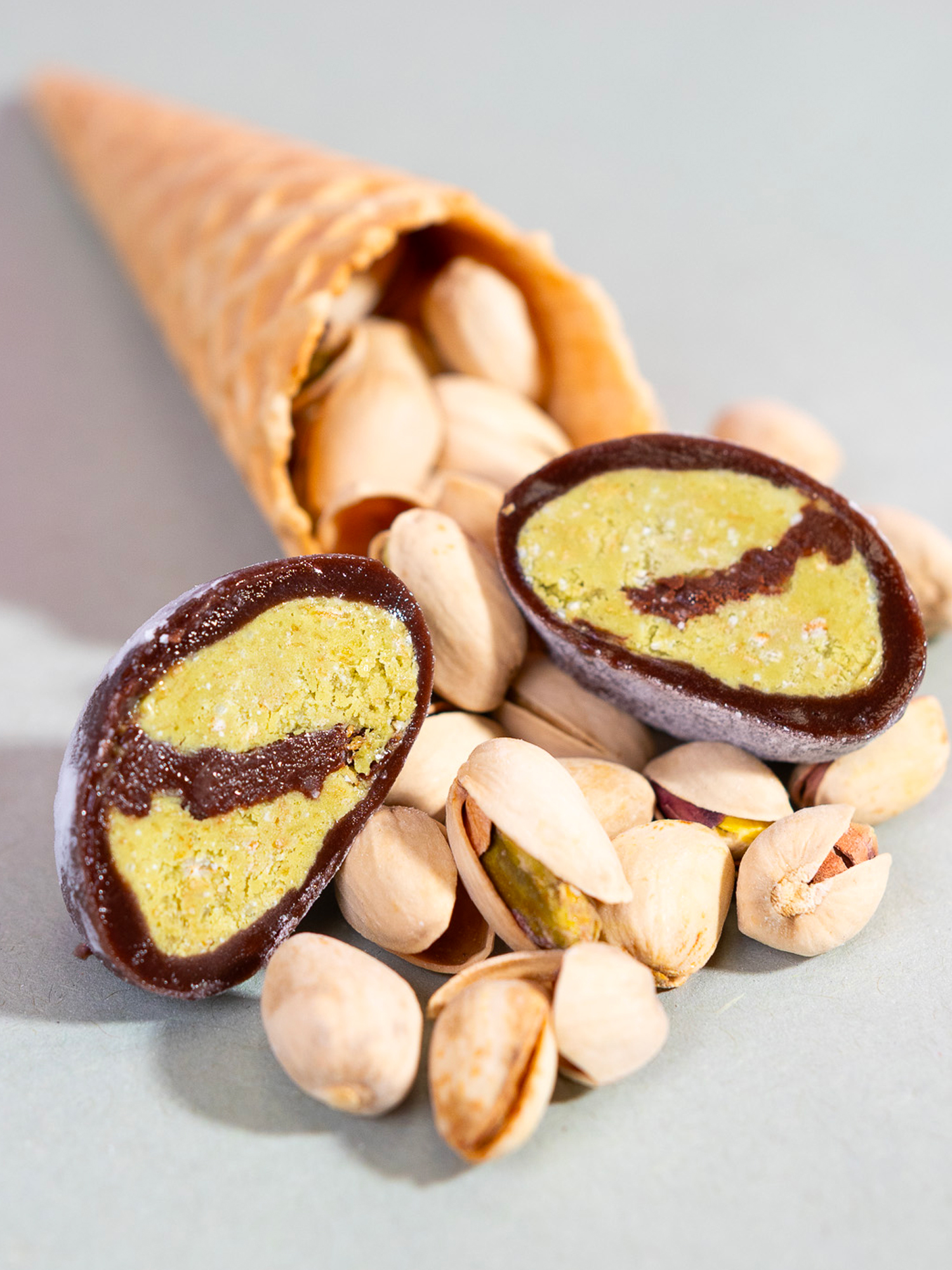 Ici, la recette repose sur une glace pistache, un cœur fondant chocolat-noisette et des éclats croustillants de kadaïf, le tout enveloppé dans une pâte de riz parfumée au cacao.