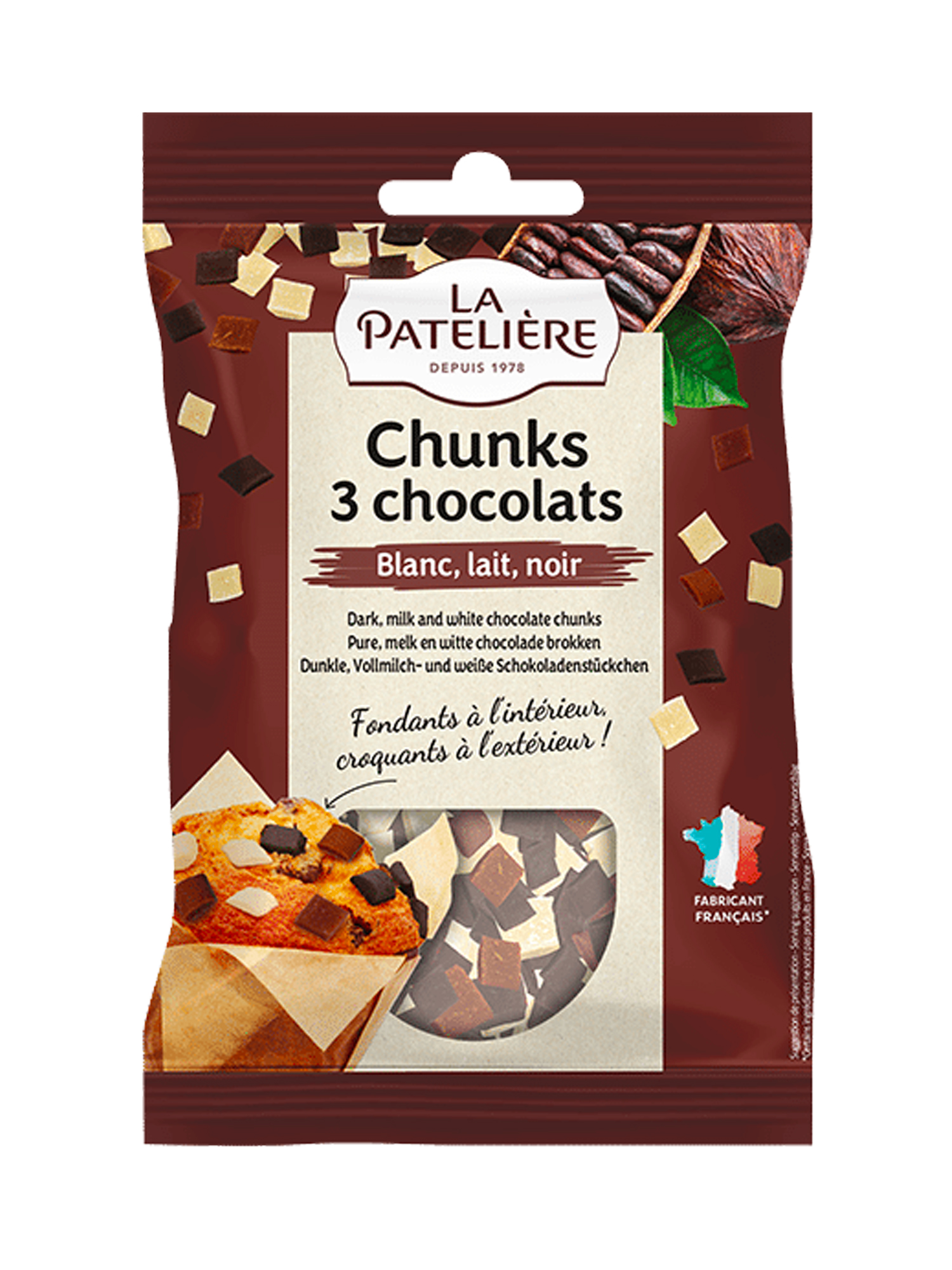 La Patelière enrichit sa gamme d’ingrédients pâtissiers avec des chunks de chocolat noir, au lait et blanc.