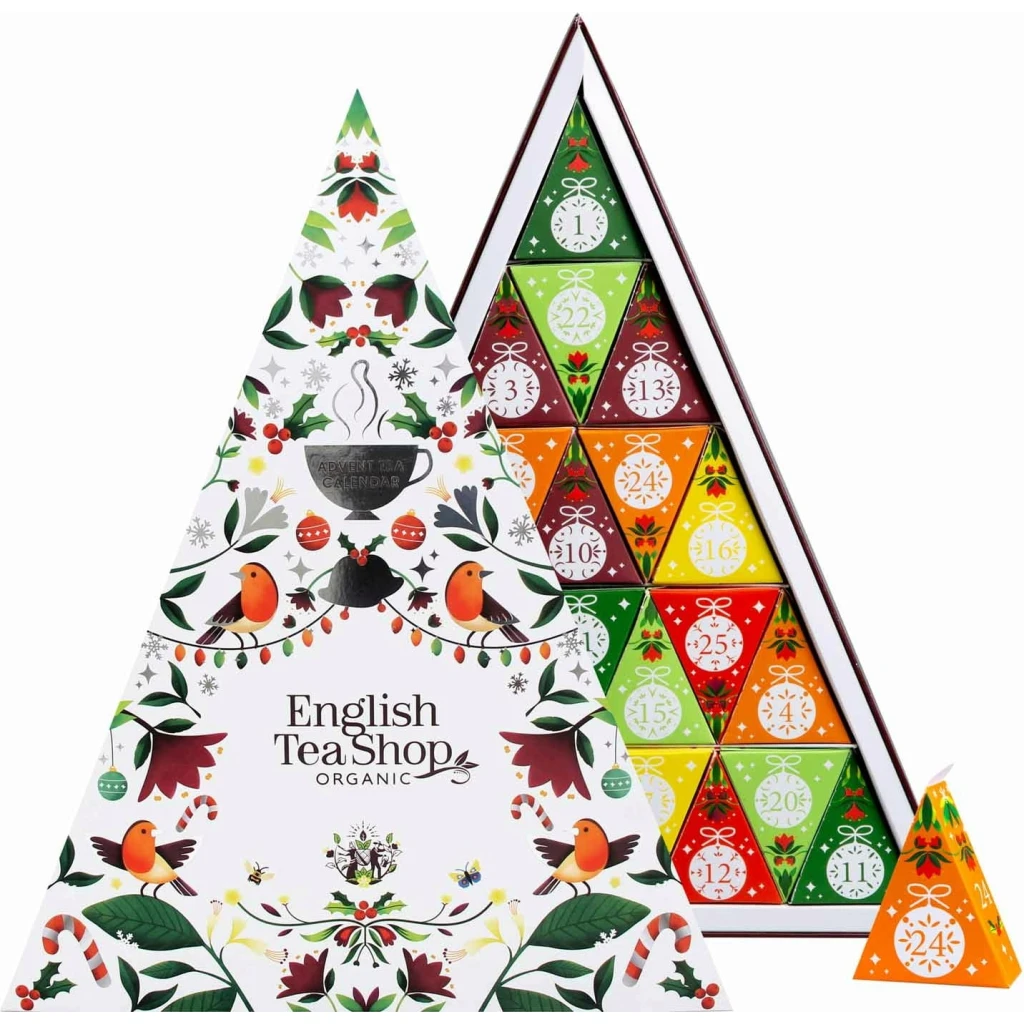 Un calendrier de l’avent joliment décoré, avec une forme triangulaire des plus originales. Une fois ouvert, le calendrier révèle une mosaïque de 25 cases triangulaires colorées. A l’intérieur de chacune d’elles, se trouve un mélange bio dans un sachet pyramidal, pour préparer une petite théière ou deux tasses d’infusion.