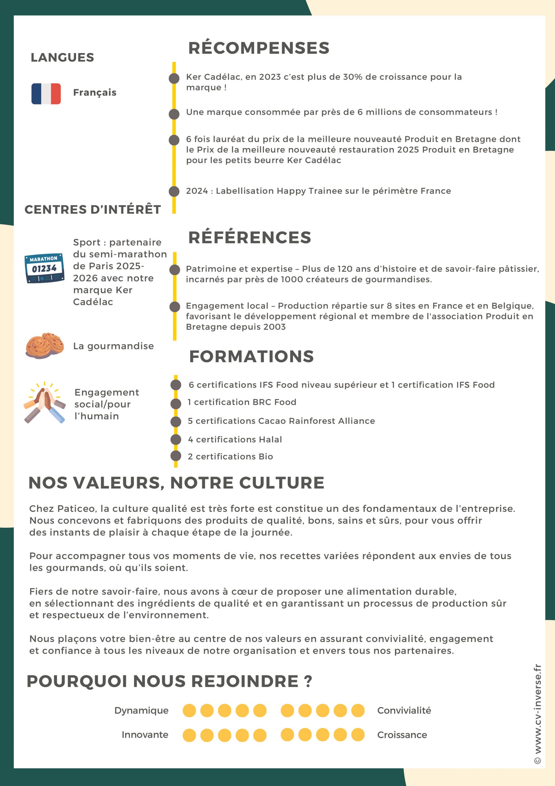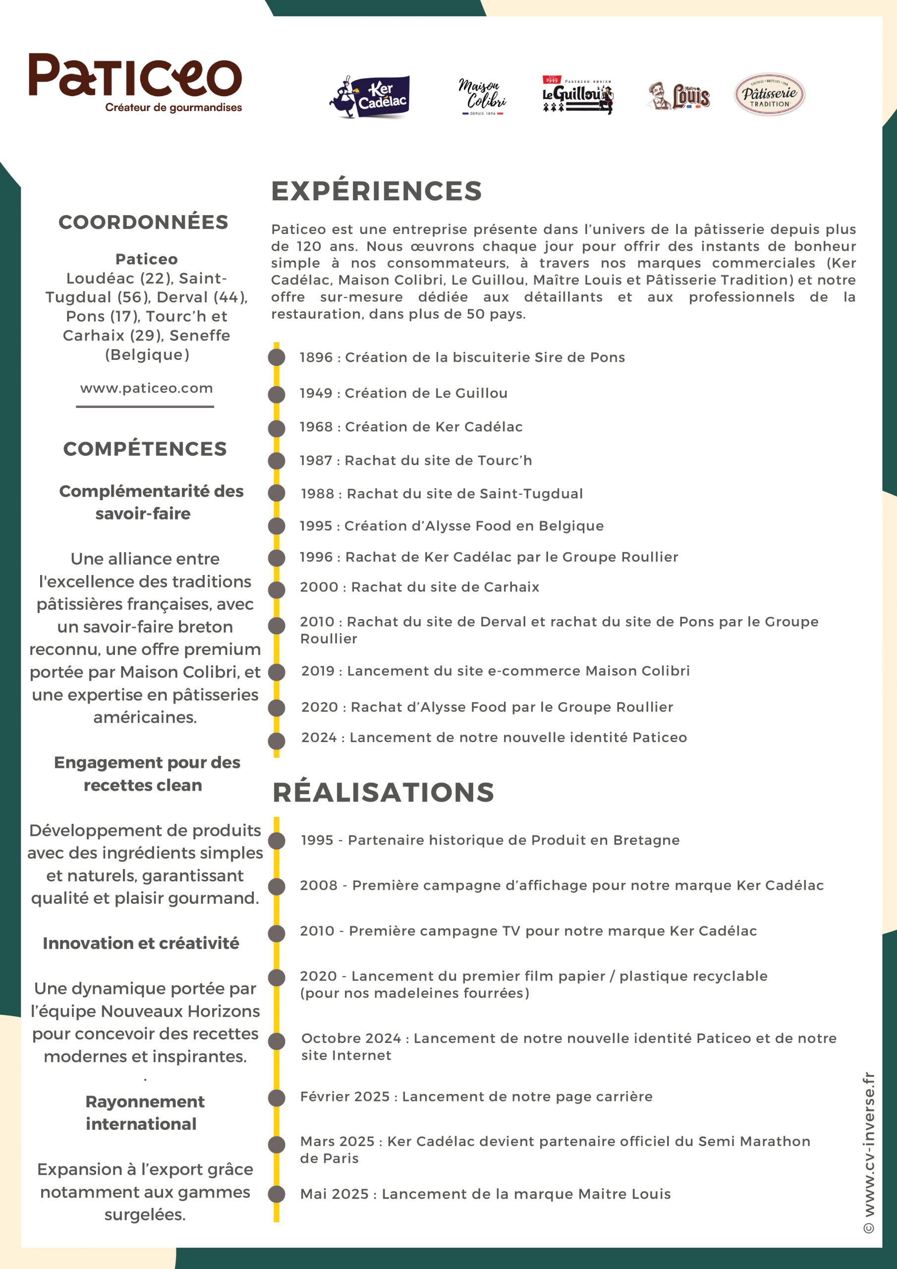 Paticeo est une entreprise présente dans l’univers de la pâtisserie depuis plus de 120 ans. Nous œuvrons chaque jour pour offrir des instants de bonheur simple à nos consommateurs, à travers nos marques commerciales (Ker Cadélac, Maison Colibri, Le Guillou, Maître Louis et Pâtisserie Tradition) et notre offre sur-mesure dédiée aux détaillants et aux professionnels de la restauration, dans plus de 50 pays.
