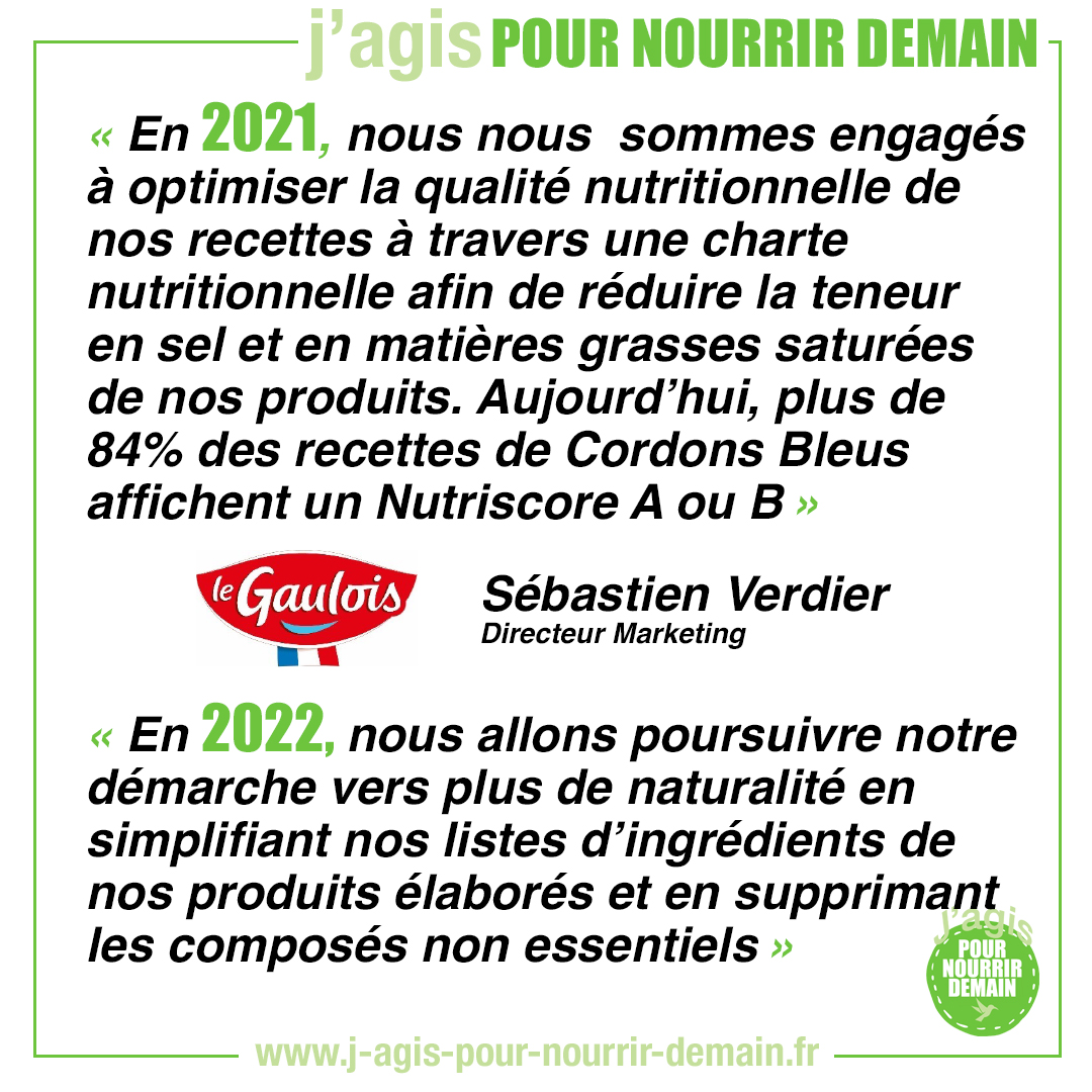 « En 2021 , Nous nous sommes engagés à optimiser la qualité nutritionnelle de nos recettes à travers une charte nutritionnelle afin de réduire la teneur en sel et en matières grasses saturées de nos produits. Aujourd’hui, plus de 84% des recettes de Cordons Bleus affichent un Nutriscore A ou B. En 2022, nous allons poursuivre notre démarche vers plus de naturalité en simplifiant nos listes d’ingrédients de nos produits élaborés en supprimant les composés non essentiels (de type additifs, conservateurs, colorants). »