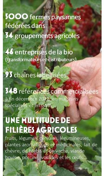 Aujourd’hui, fort de ses 93 chaînes labellisées, le label favorise une agriculture paysanne dont les produits sont 100% origine France et issus de relations commerciales durables. 348 références portant le label sont commercialisées à fin décembre 2021 et disponibles dans les rayons des magasins spécialisés bio et en GMS (voir la liste des marques labellisées).
