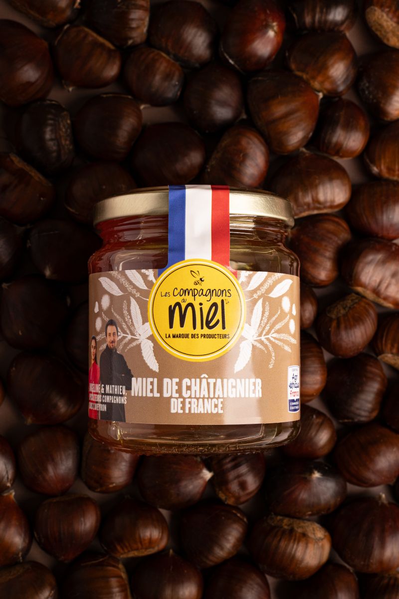Les Compagnons du Miel mettent en avant un miel de Châtaignier à la robe ambrée foncée et au profil gustatif affirmé.