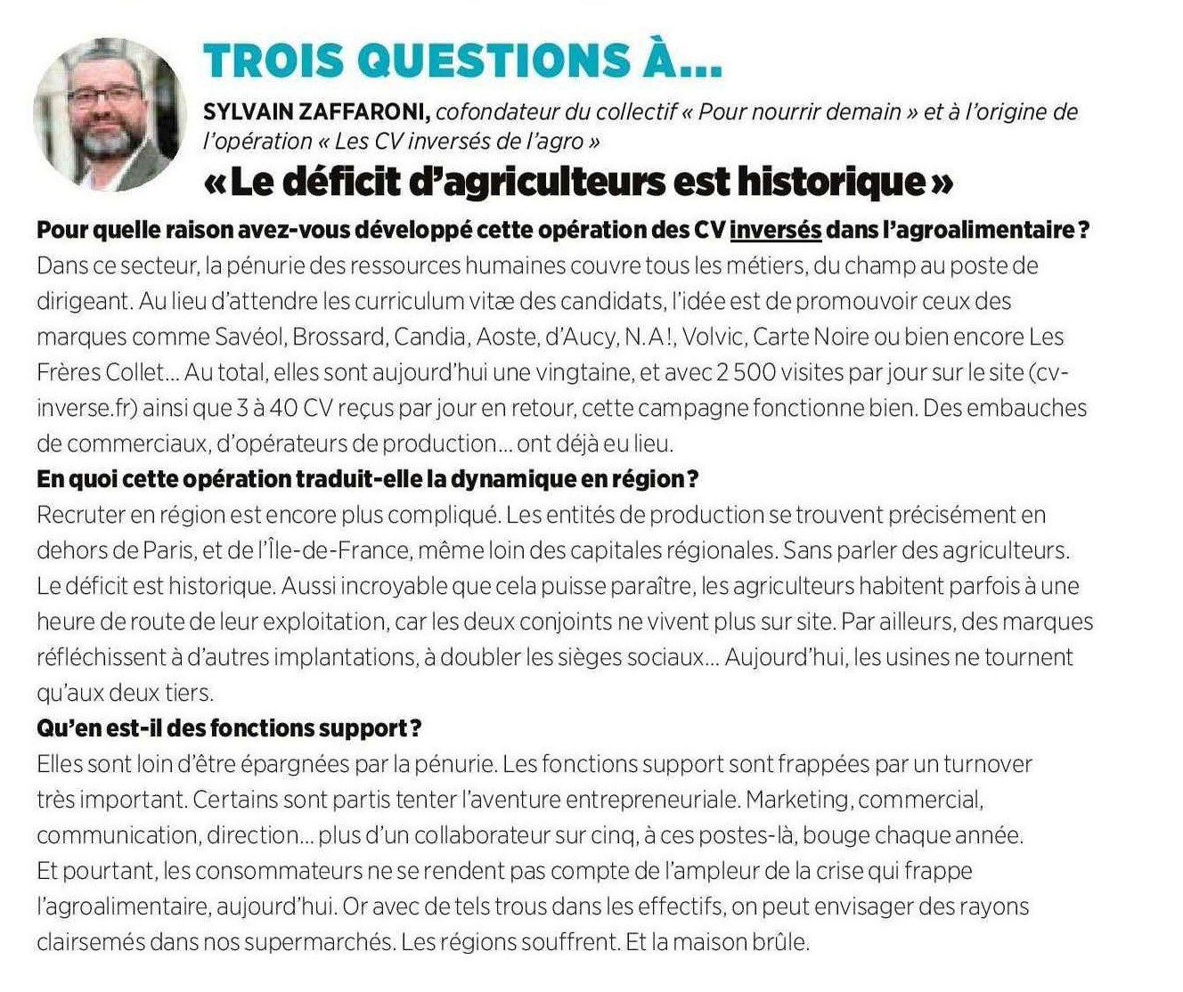 (…) « Pour quelle raison avez-vous développé cette opération des CV inversés dans l’agroalimentaire ? Dans ce secteur, la pénurie des ressources humaines couvre tous les métiers, du champ au poste de dirigeant. Au lieu d’attendre les curriculum vitæ des candidats, l’idée est de promouvoir ceux des marques comme Savéol, Brossard, Candia, Aoste, d’Aucy, N.A!, Volvic, Carte Noire ou bien encore Les Frères Collet…Au total, elles sont aujourd’hui une vingtaine, et avec 2 500 visites par jour sur le site (cv inverse.fr) ainsi que 3 à 40 CV reçus par jour en retour, cette campagne fonctionne bien. Des embauches de commerciaux, d’opérateurs de production… ont déjà eu lieu. En quoi cette opération traduit-elle la dynamique en région ? (…)