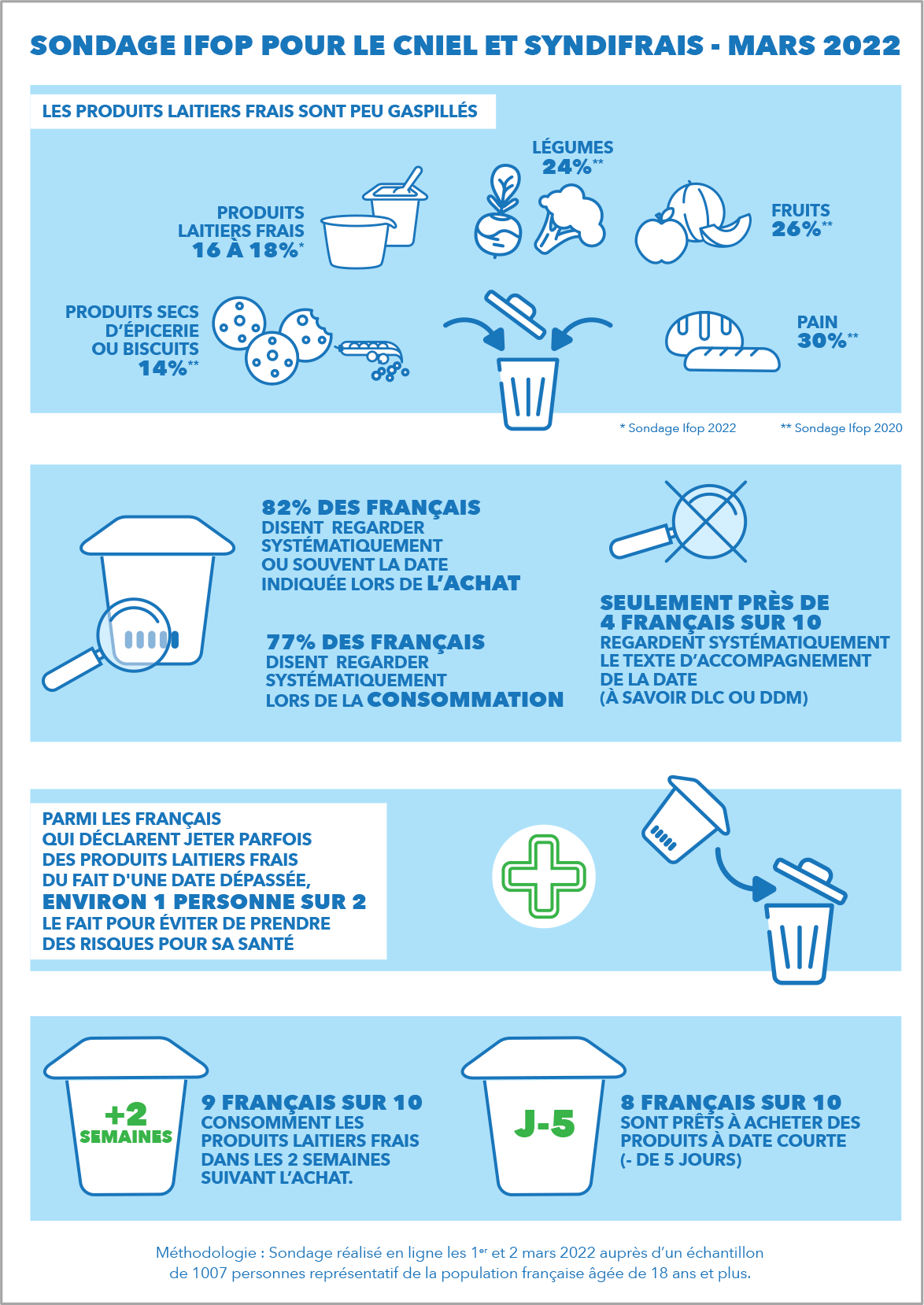 Parmi les Français qui déclarent jeter parfois des produits laitiers frais, environ 1 personne sur 2 le fait pour éviter de prendre des risques pour sa santé (de 52% pour les crèmes aux œufs à 45% pour les desserts liégeois ou les mousses au chocolat et 47% pour les yaourts nature ou aux fruits). C’est bien là l’objet de la mention « A consommer jusqu’au » qui vise à garantir une absence de risque sanitaire lors de la consommation des produits.