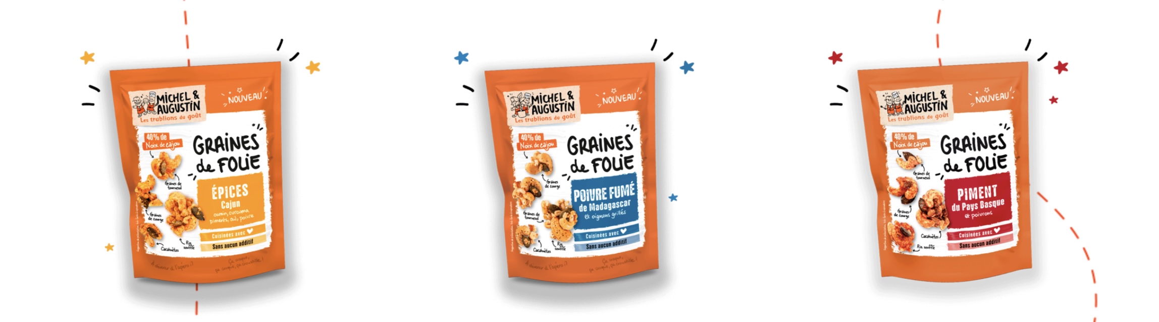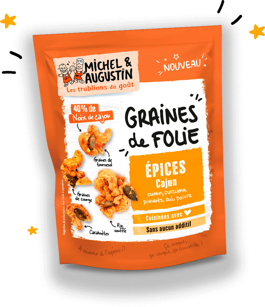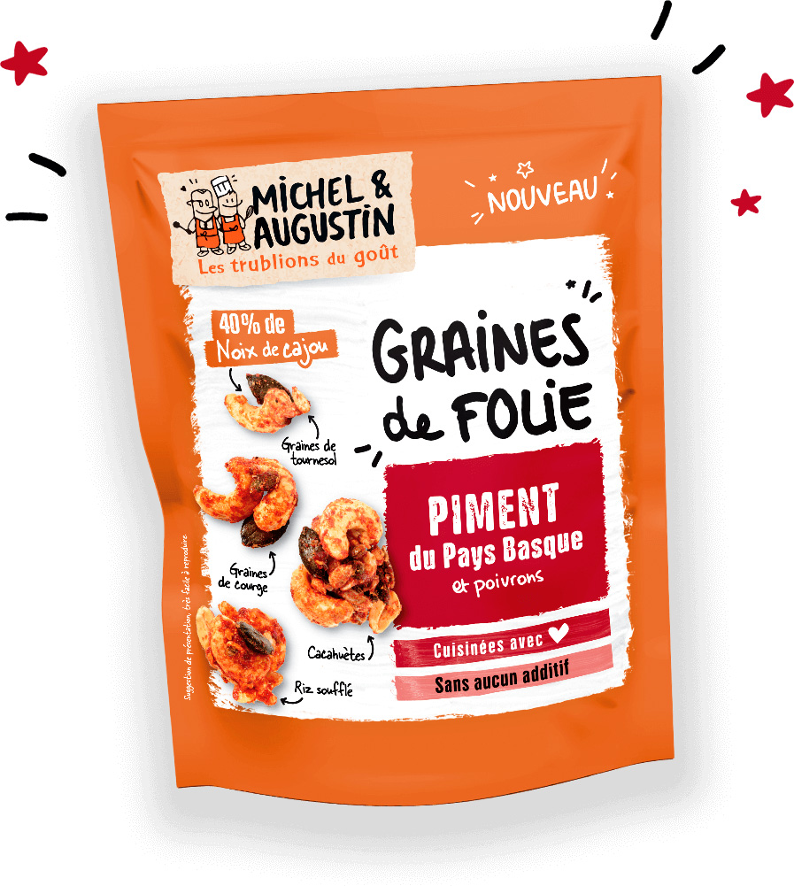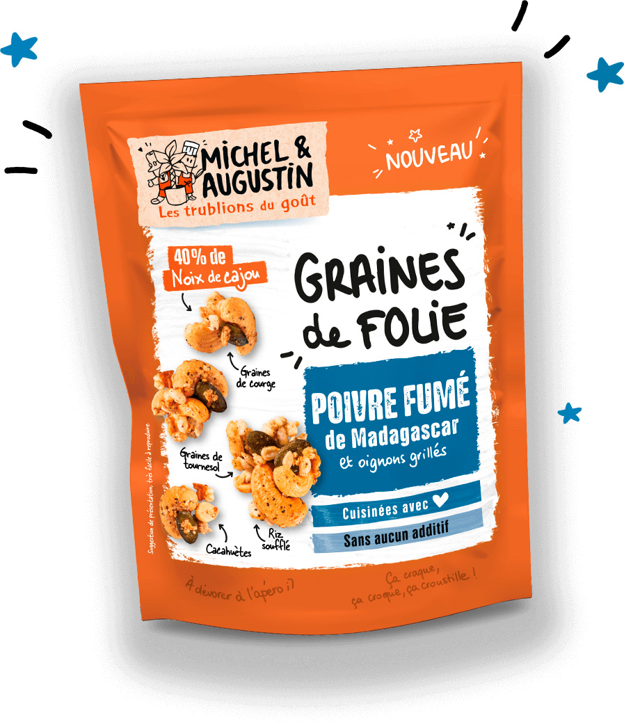 L’équipe de Michel et Augustin a concocté des mélanges détonants de graines pour réveiller nos apéros avec des noix de cajou, des graines de tournesol et de courge, du riz soufflé et des cacahuètes.
