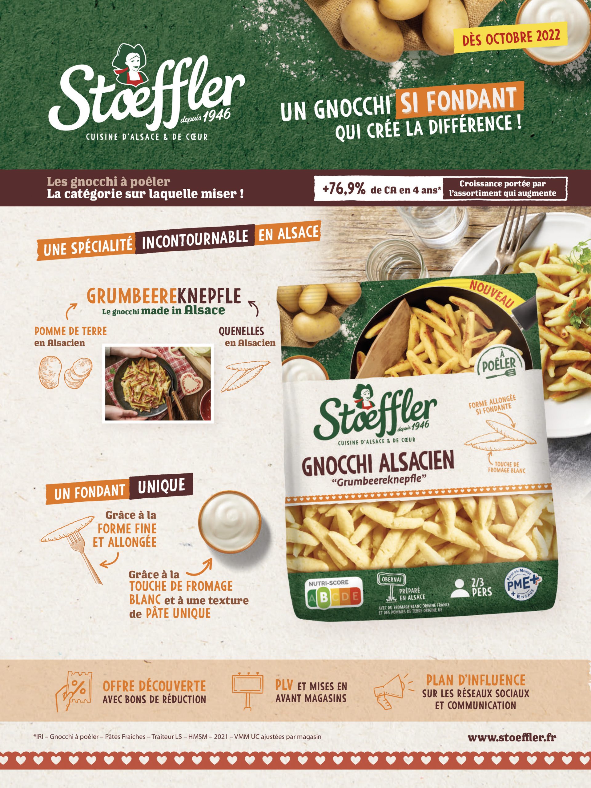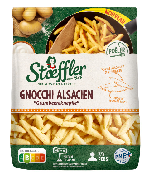 « C’est un recette traditionnelle alsacienne que ma grand-mère nous préparait quand j’étais petit. C’est, à base de pomme de terre et avec une touche de fromage blanc. Avec la pâte obtenue, elle façonnait des petites quenelles en les faisant rouler dans ses paumes de mains. Elle les plongeait dans l’eau pour les cuire puis les poëlait pour leur apporter du croustillant. Nous avons reproduit ce souvenir d’enfance en veeillant à avoir une forme pas trop grosse pour se rapprocher de la forme du gnocchi italien queles gens connaissent d’avantage. » explique Philippe, Responsable de l’atelier Pâtes Fraîches de Stoeffler.
