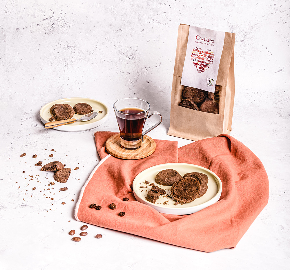 Ce cookie mœlleux intègre dans sa recette deux produits upcyclés : d’une part les drêches de brasserie, riches en fibres et en protéines, et d’autre part, des pellicules argentées des grains de café récupérées chez un torréfacteur.