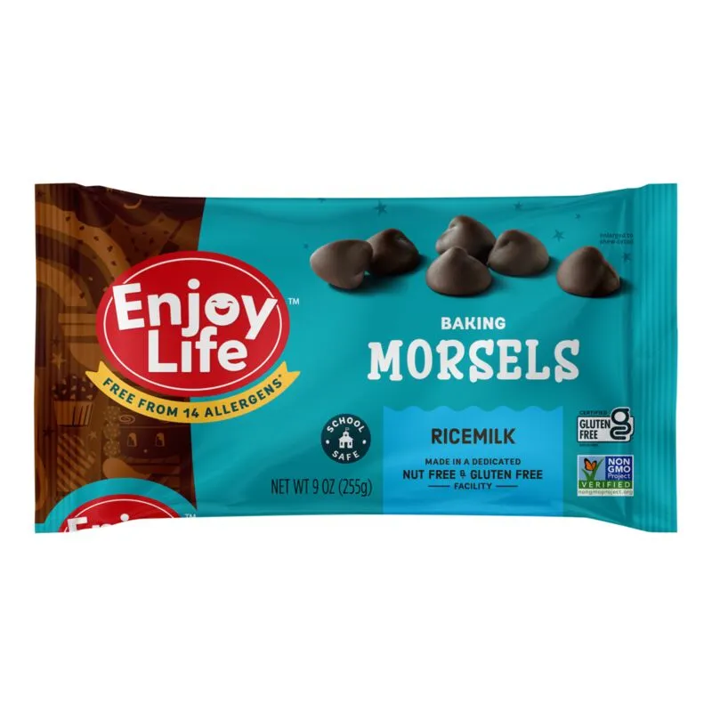 Le chocolat utilisé par Enjoy Life est élaboré à partir de chocolat non sucré et de beurre de cacao (tous deux sans produits laitiers), ainsi que de sirop de riz séché réduit en poudre.
