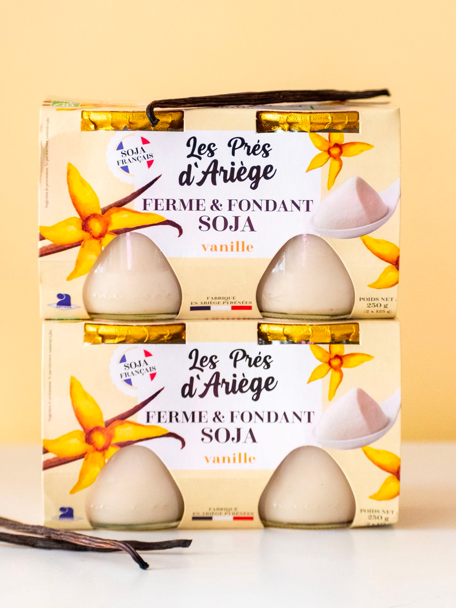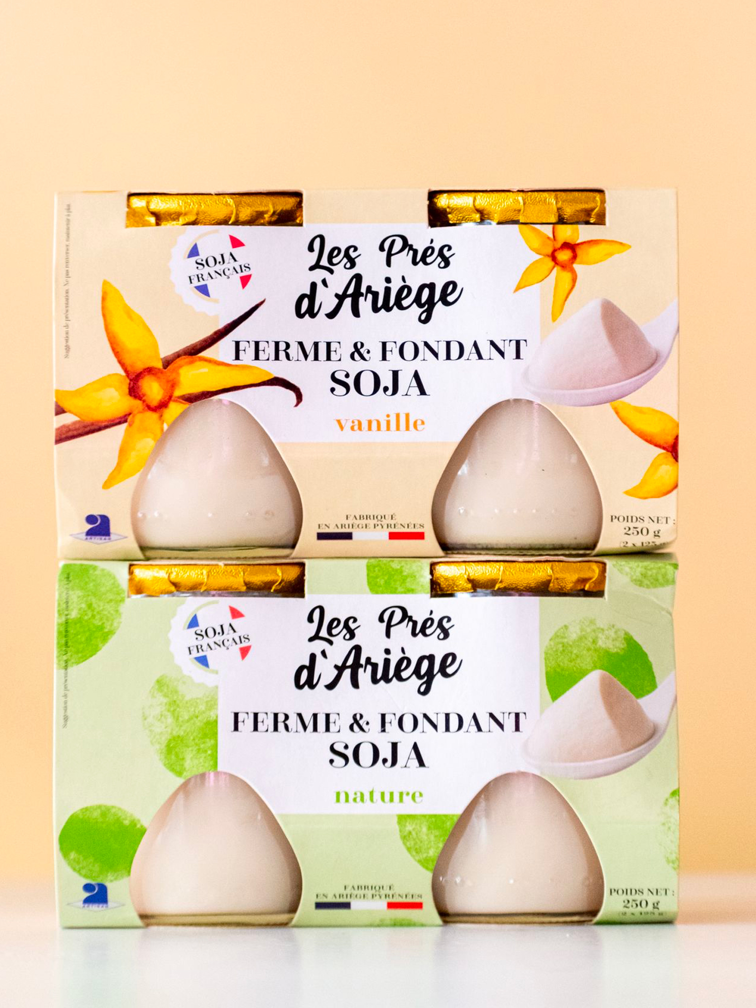 Les Prés d’Ariège propose une version végétale d’un grand classique du rayon frais avec « Ferme & fondant », un dessert à base de soja travaillé par étuvage lent. Ce procédé rappelle celui du yaourt traditionnel, mais ici, tout est 100 % végétal.