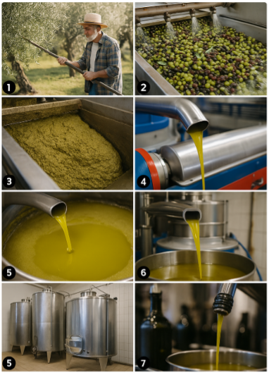 1. La récolte : Les olives sont cueillies à maturité : soit manuellement (méthode plus coûteuse) ou par des procédés mécanisés. Les olives doivent être entières, non abîmées et rapidement transportées au moulin pour préserver la qualité aromatique et éviter une oxydation précoce.