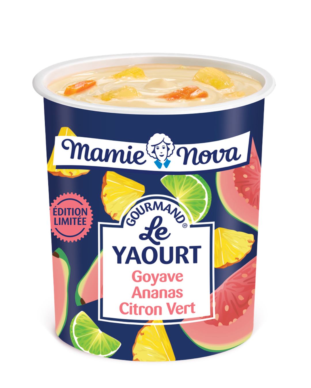 Le yaourt Goyave Ananas Citron Vert joue la carte de l’exotisme en combinant trois fruits solaires dans une base au lait entier.