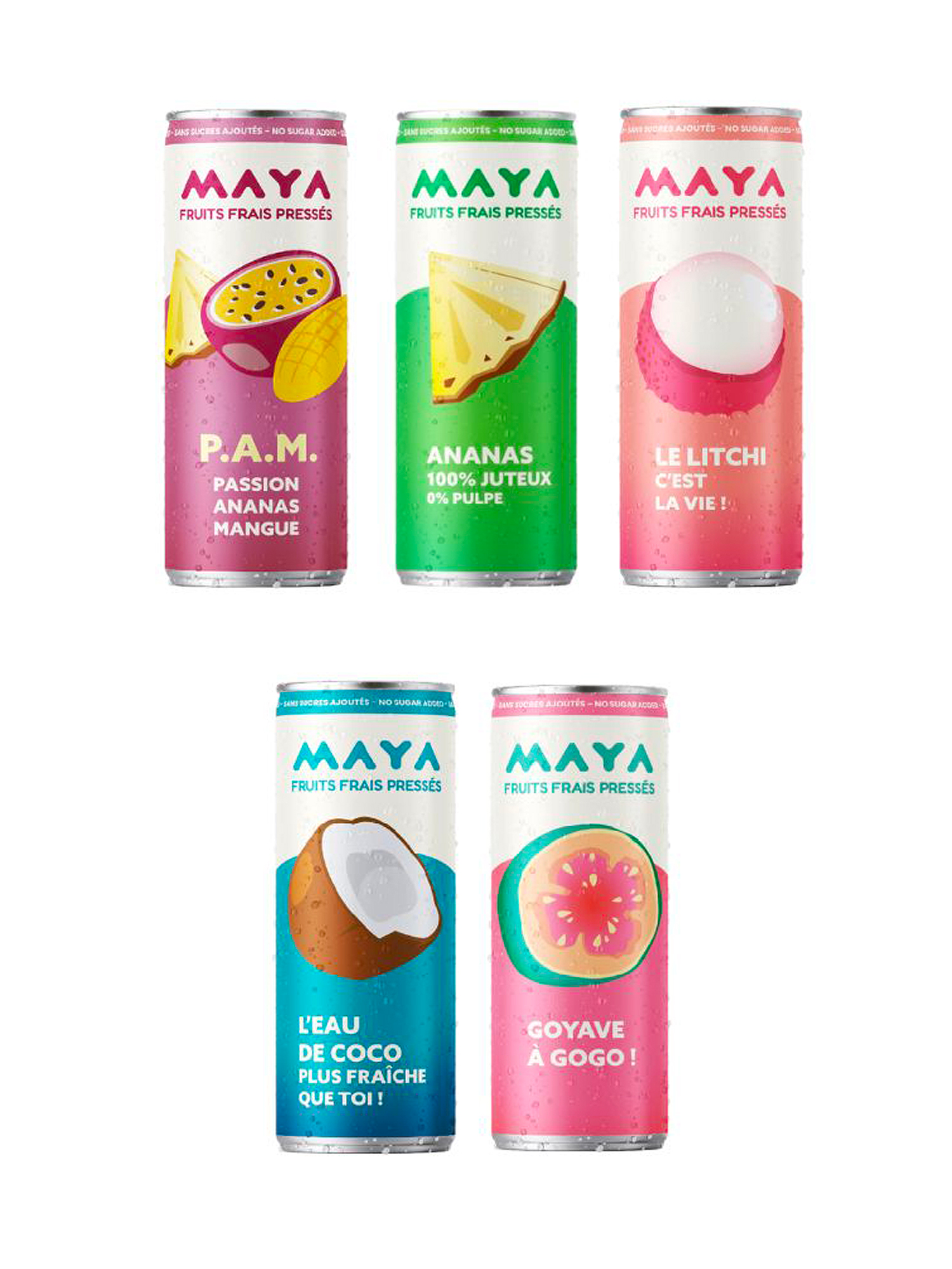 Avec ses canettes colorées au ton décontracté, Maya transforme le jus de fruits en compagnon de poche.