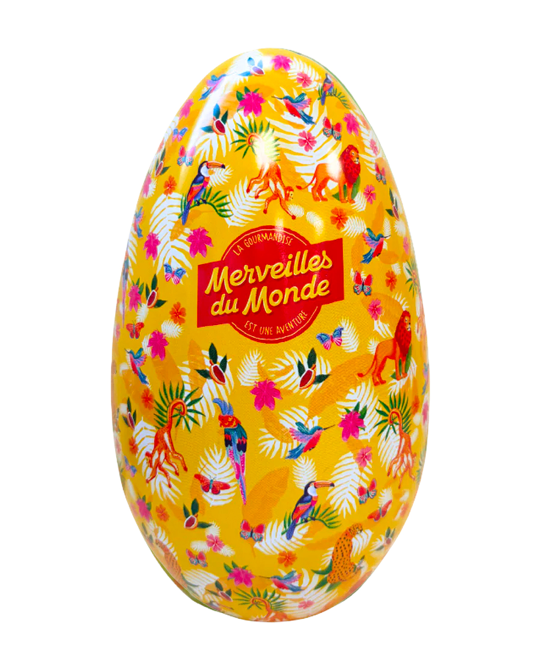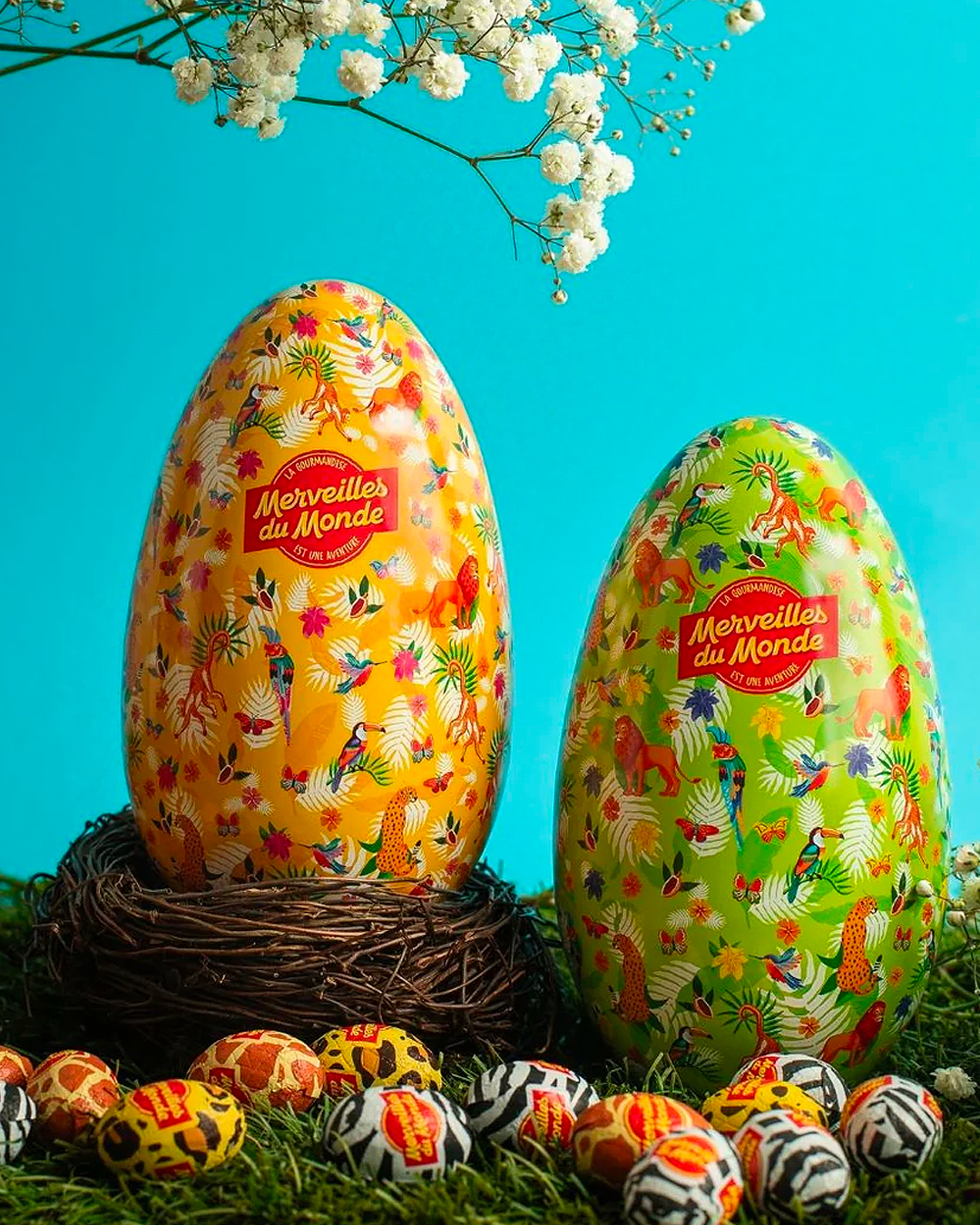 Merveilles du Monde habille pâques de couleurs éclatantes avec deux maxi-œufs métalliques, l’un jaune solaire, l’autre vert profond, clin d’œil assumé à l’univers sauvage cher à la marque.