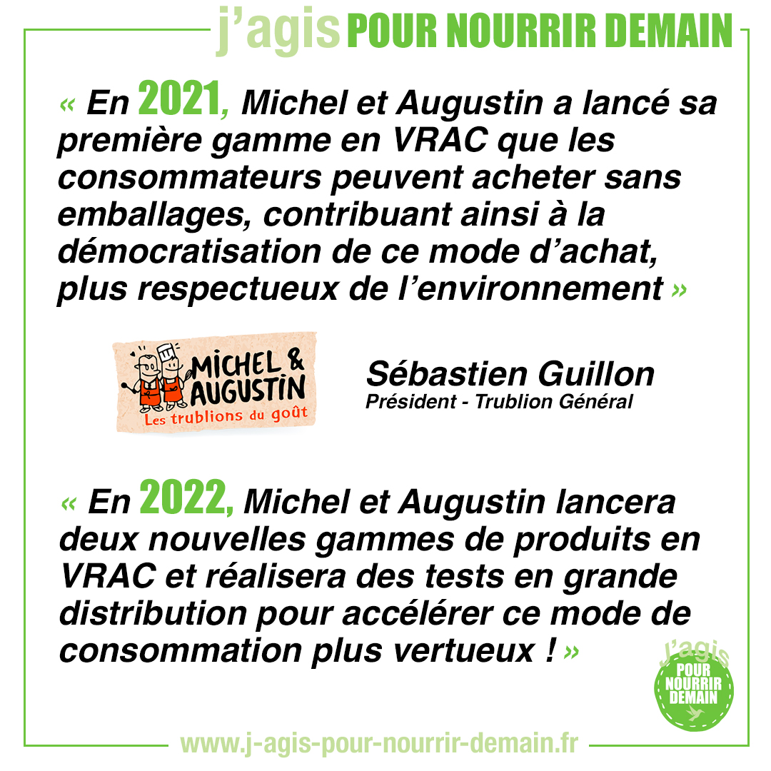 « En 2021, Michel et Augustin a lancé sa première gamme en VRAC que les consommateurs peuvent acheter sans emballages, contribuant ainsi à la démocratisation de ce mode d’achat, plus respectueux de l’environnement. En 2022 Michel et Augustin lancera deux nouvelles gammes de produits en VRAC et réalisera des tests en grande distribution pour accélérer ce mode de consommation plus vertueux ! »