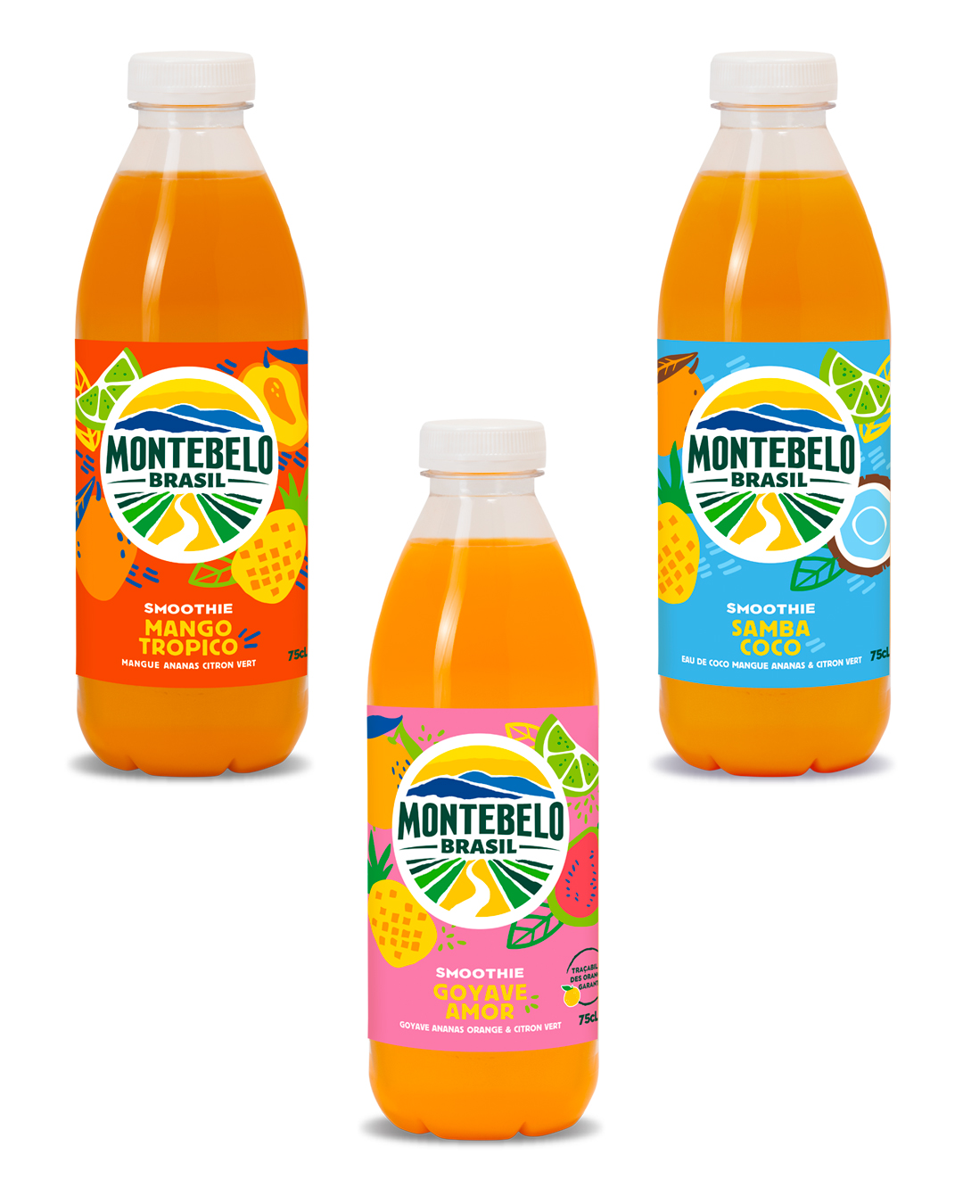 Montebelo Brasil attire l’attention avec des smoothies en bouteille de 75 cl qui misent sur des recettes fruitées et colorées.