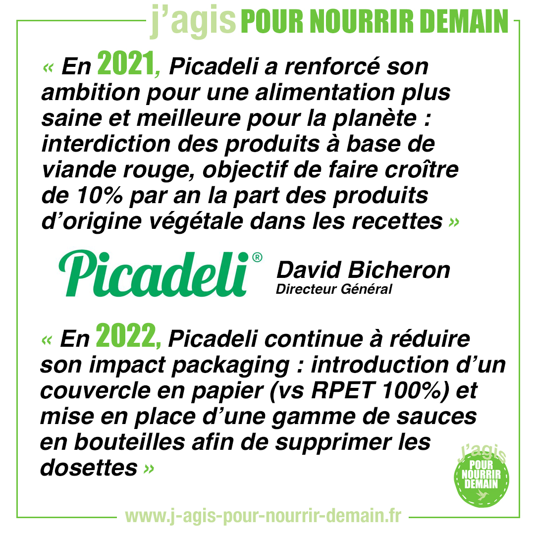 « En 2021, Picadeli a renforcé son ambition pour une alimentation plus saine et meilleure pour la planète : interdiction des produits à base de viande rouge, objectif de faire croître de 10% par an la part des produits d’origine végétale dans notre assortiment et mise en avant des produits et des recettes de saison. En 2022, Picadeli continue à réduire son impact packaging : introduction d’un couvercle en papier (vs RPET 100%) et mise en place d’une gamme de sauces en bouteilles afin de supprimer les dosettes. »