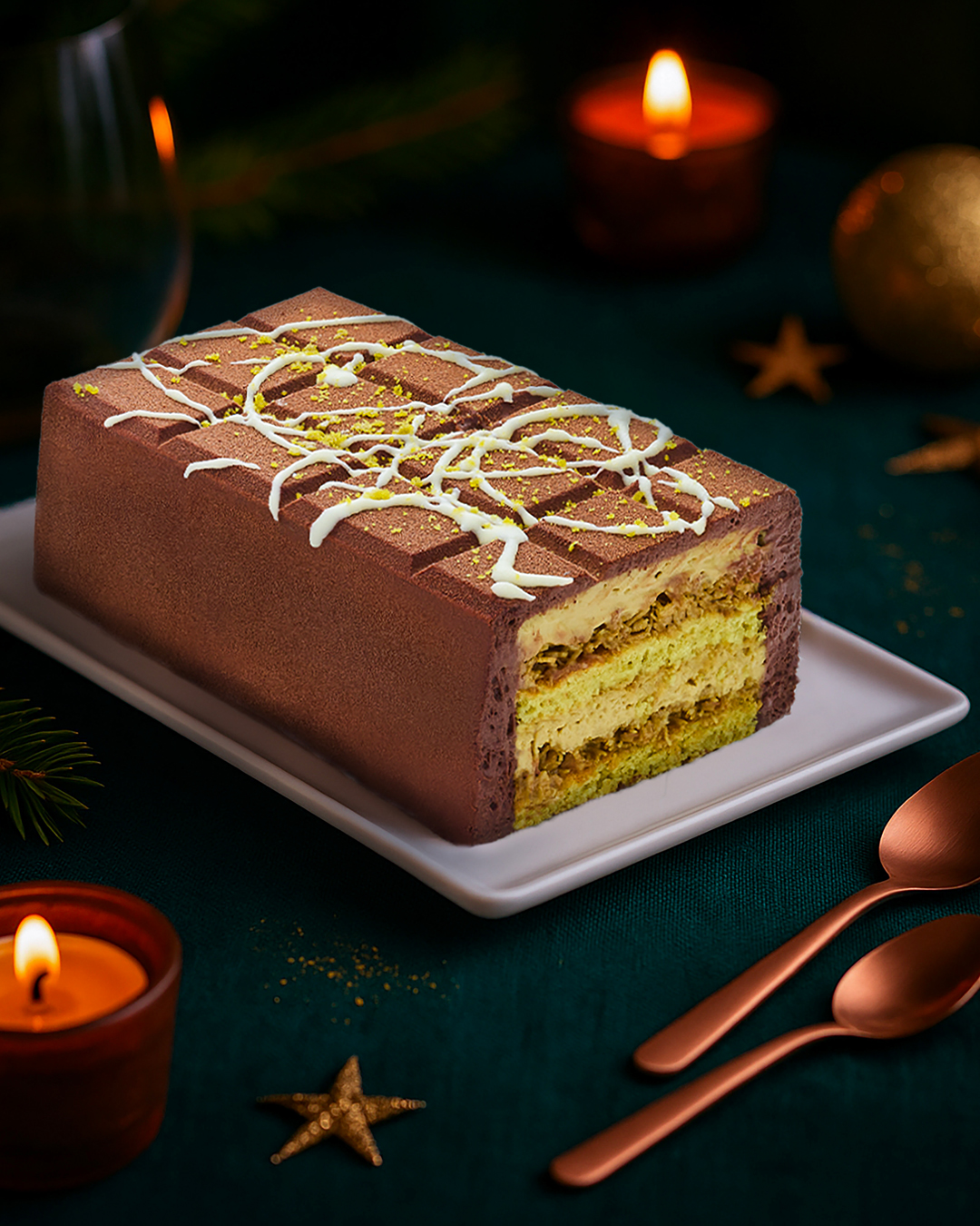Cette bûche pâtissière s’inscrit dans la veine des desserts ultra gourmands, avec un enchaînement de textures qui pousse à la surenchère : mousse chocolat, cœur crémeux, croustillant praliné et biscuit pistache, le tout habillé d’un velours chocolat noir.