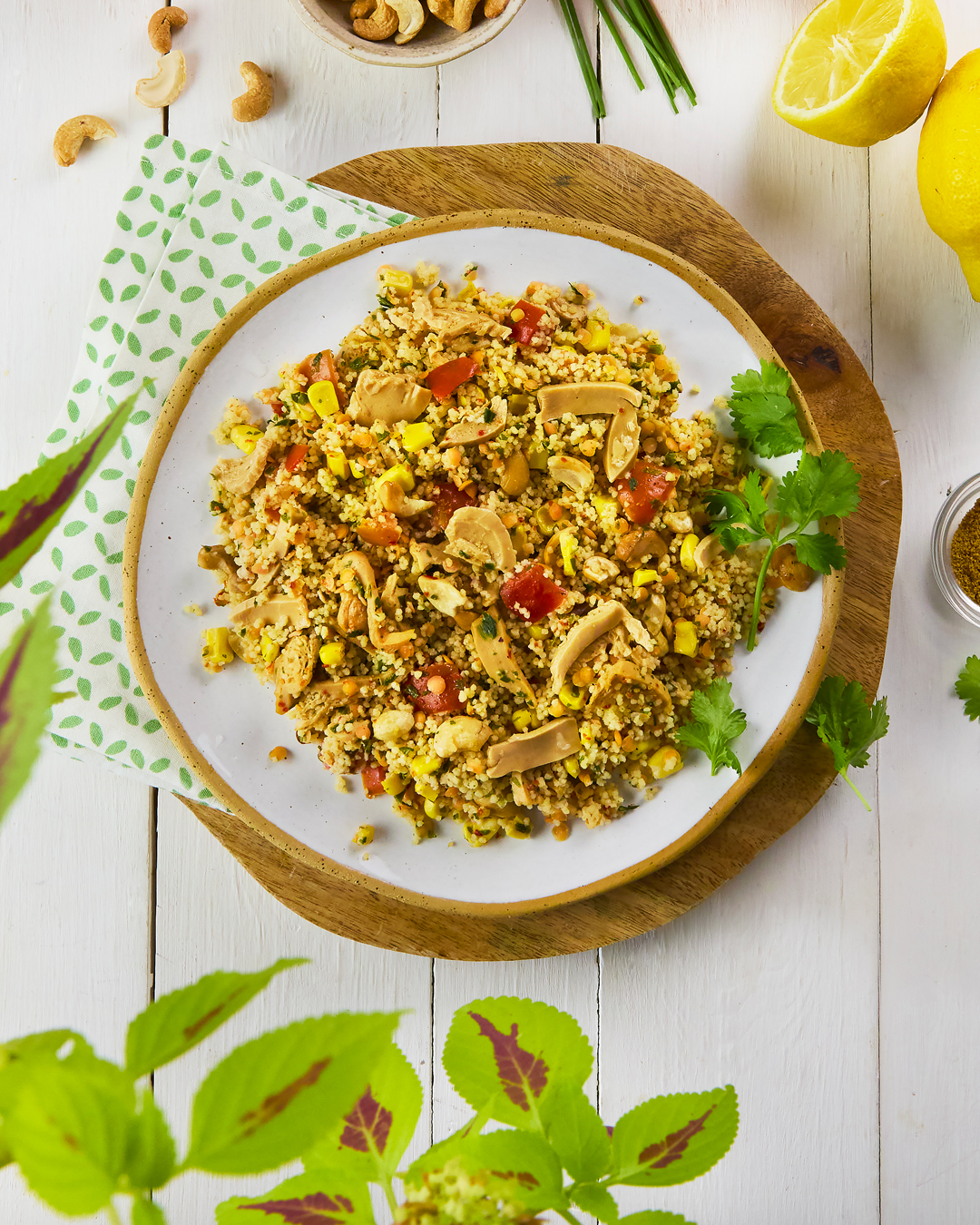 Cette recette associe couscous, lentilles corail, légumes et noix de cajou pour proposer un plat complet et rassasiant .