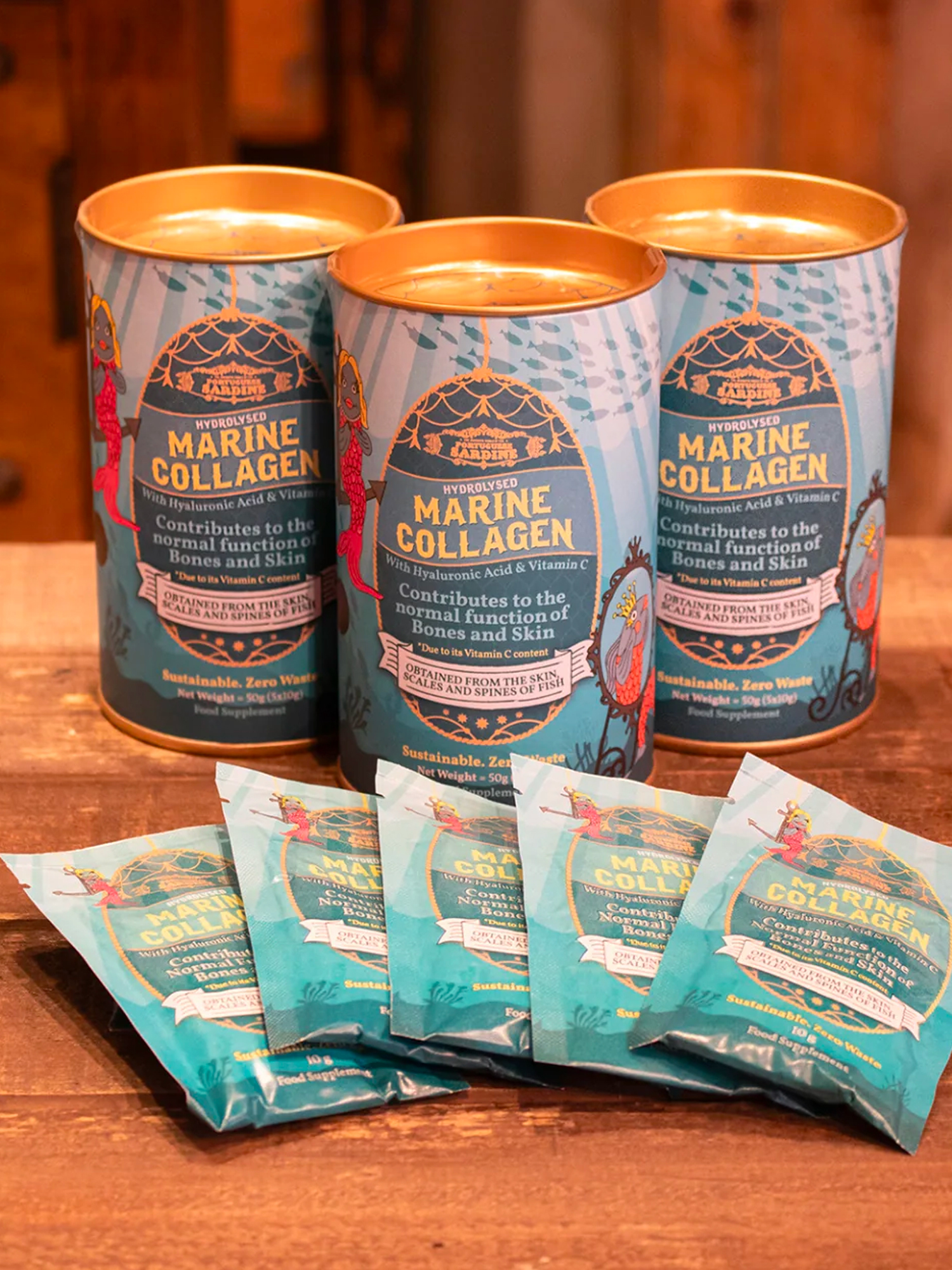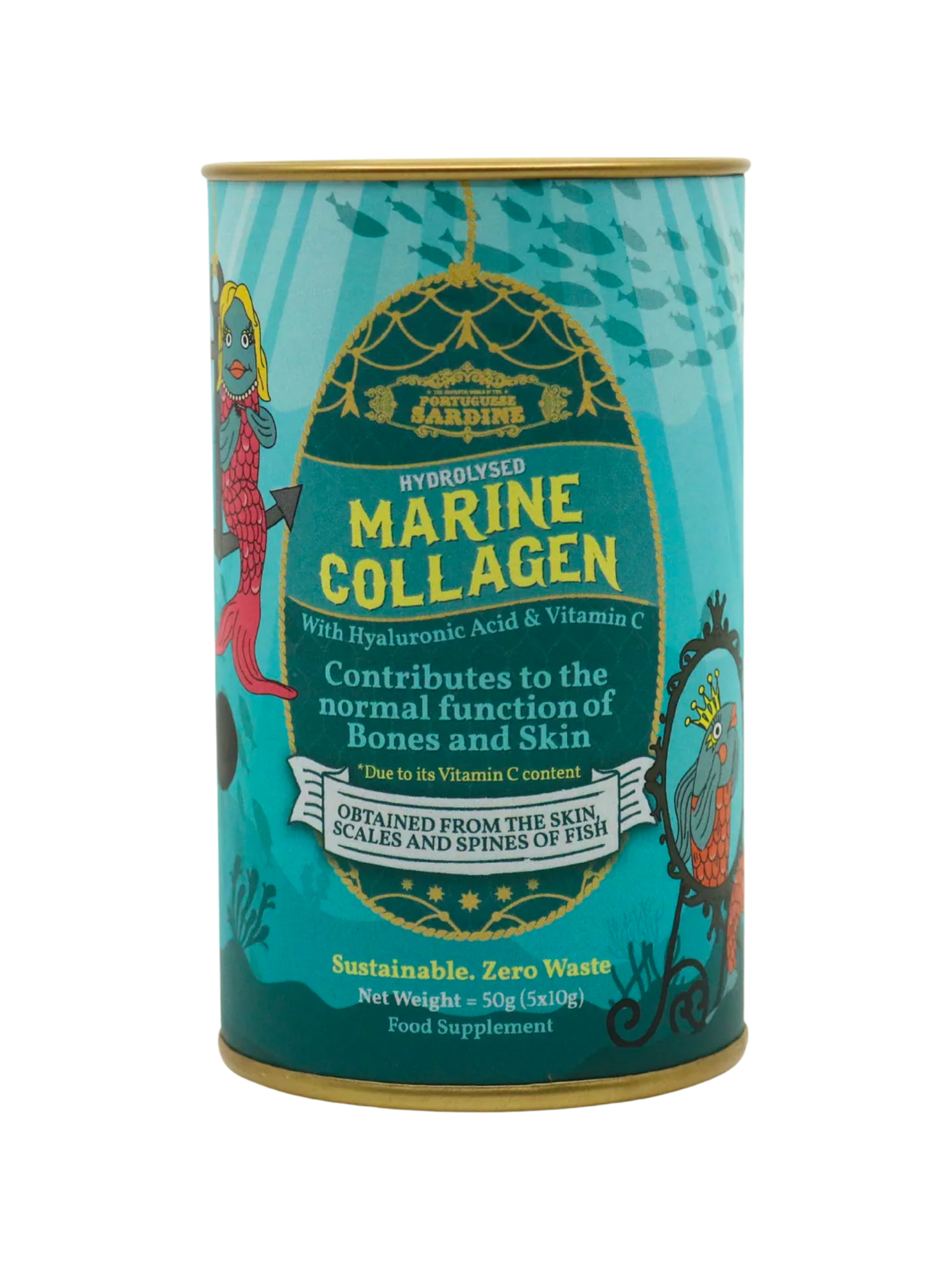 Elle pousse désormais l’upcycling à un niveau inattendu : les peaux, écailles et arêtes de poissons se retrouvent transformées en collagène marin hydrolysé, présenté dans un packaging façon boîte de conserve, fidèle à son univers graphique.