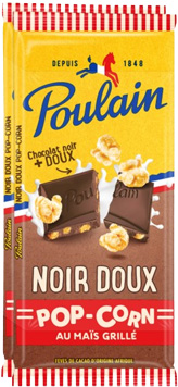 Poulain Noir Doux Popcorn, un délicieux chocolat noir avec une touche de lait pour un goût plus doux, associé à la texture et au goût unique de l’incontournable Pop corn.