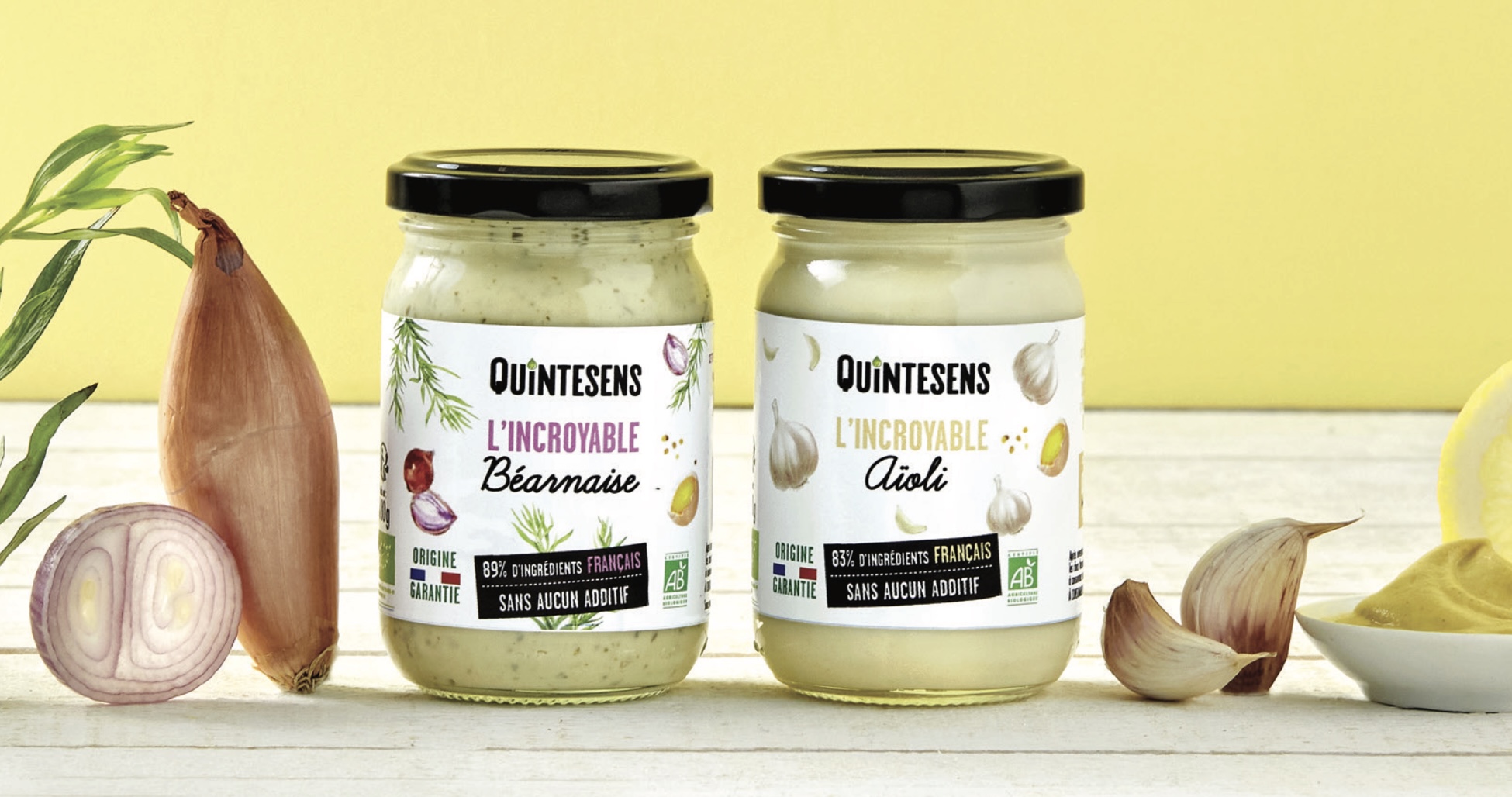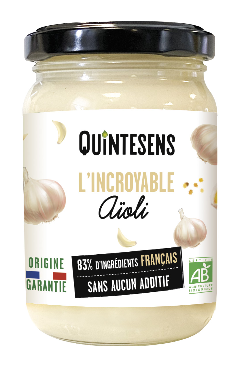 Cette sauce, née dans le sud de la France, fait sûrement partie des sauces les plus savoureuses de notre patrimoine. Réalisée avec plus de 12% d’ail bio et pas le moindre additif, elle tient toutes ses promesses et comblera les gourmets les plus exigeants. Aussi bonne pour nos papilles que pour notre santé, elle fait la part belle à nos agriculteurs avec plus de 83% de matières premières bio cultivées en France ! Et comme Quintesens est toujours en quête du meilleur, d’ici 2023, 95% des ingrédients seront français. La marque mettra ainsi sur le marché la 1ère sauce aïoli dont l’ail sera 100% bio français.