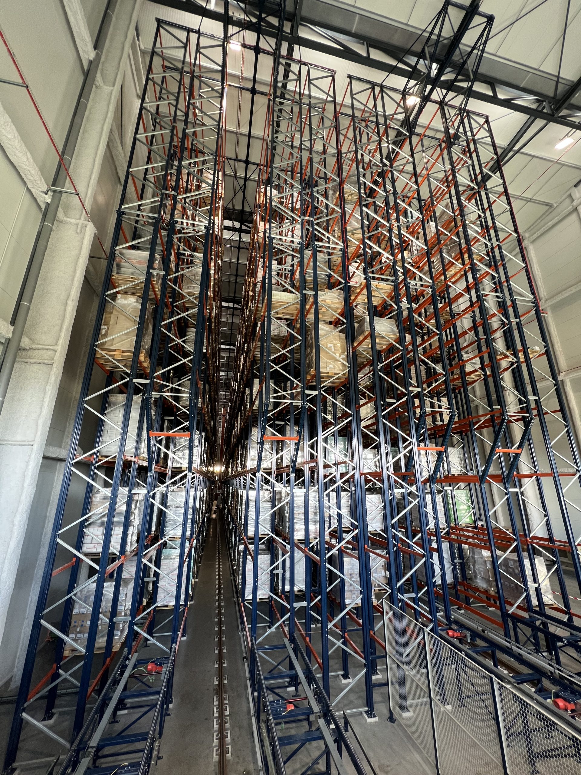 D’une capacité de 6 376 palettes grâce à des rayonnages de 21,5 m de haut, le magasin se distingue par la longueur de ses deux allées : 92 m. Un transstockeur circule dans chaque allée et réalise de façon autonome les opérations de stockage, de déchargement et de transport des palettes.