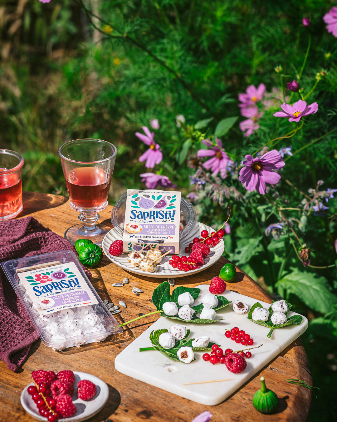 À l’opposé des traditionnels cubes souvent fades, Sapristi propose une collection surprenante : chèvre fourré au miel ou à la figue, enrobages tournesol ou aneth, antipasti, ou encore roquefort-noisette-cranberry.