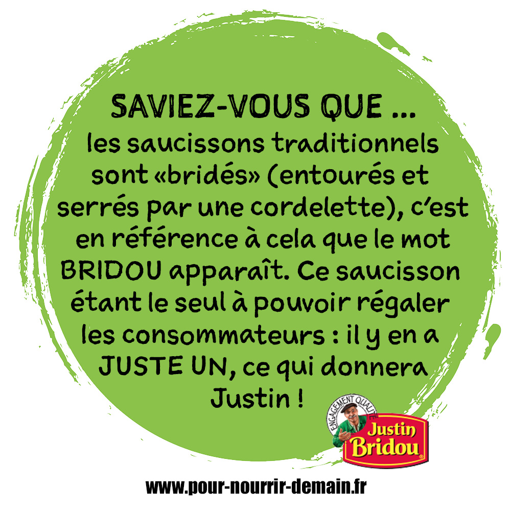 Saviez-vous que … les saucissons traditionnels sont « bridés » (entourés et serrés par une cordelette), c’est en référence à cela que le mot BRIDOU apparaît. Ce saucisson étant le seul à pouvoir régaler les consommateurs : il y en a JUSTE UN, ce qui donnera Justin !