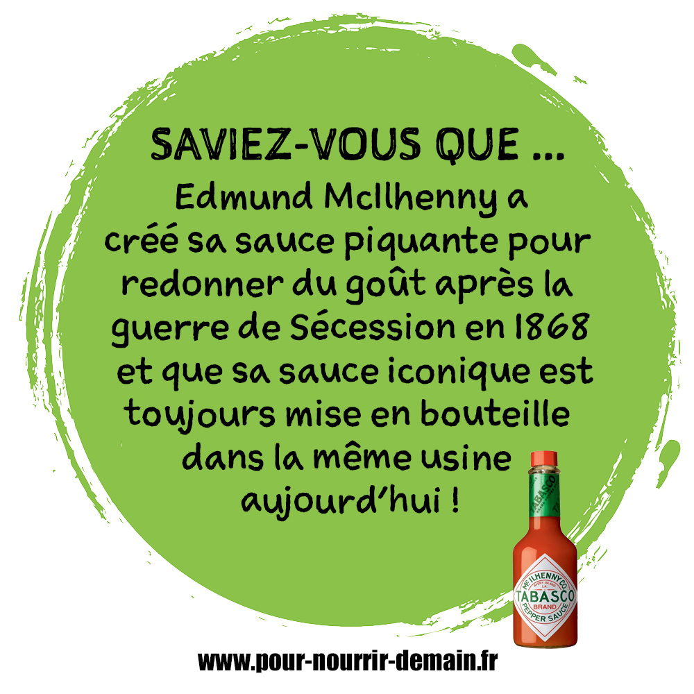 Saviez-vous que … Edmund McIlhenny a créé sa sauce piquante pour redonner du goût après la guerre de Sécession en 1868 et que sa sauce iconique est toujours mise en bouteille dans la même usine aujourd’hui.