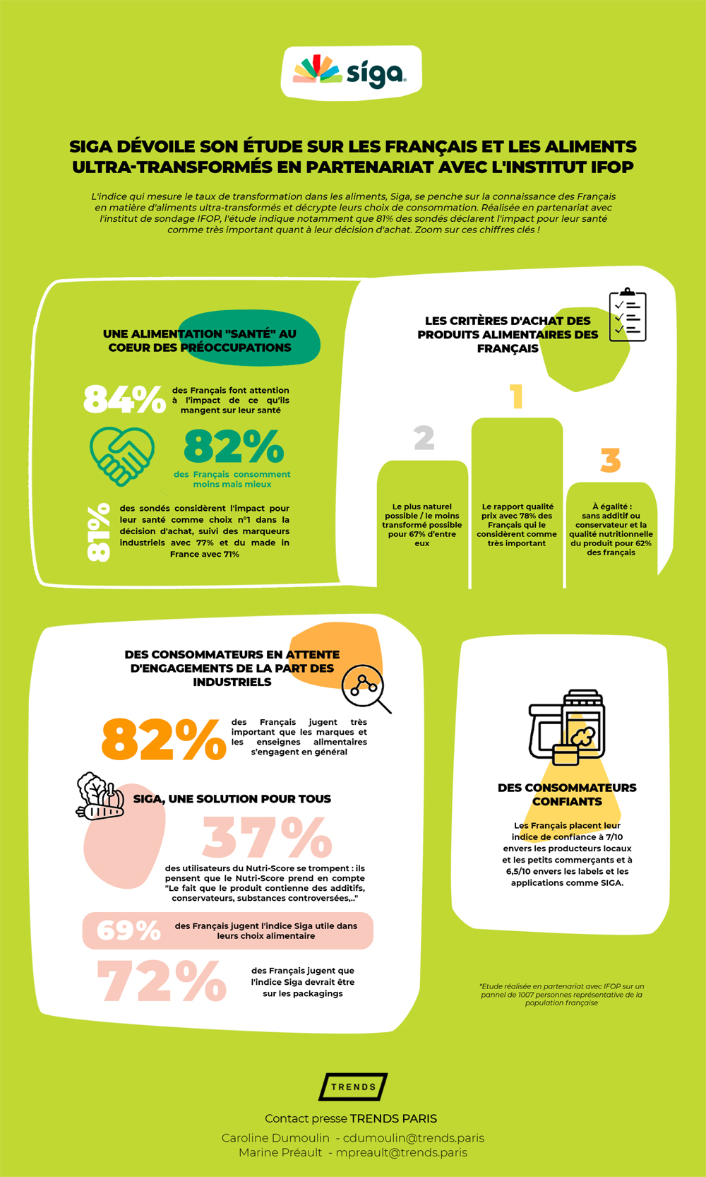 L’indice que mesure le taux de transformation dans les aliments, Siga, se penche sur la connaissance des français en matière d’aliments ultra-transformés et décrypte leurs choix de consommation. Réalisée en partenariat avec l’institut de sondage IFOP, l’étude indique notamment que 81% des sondés déclarent l’impact pour leur santé comme très important quand à leur décision d’achat. Zoom sur ces chiffres clés.