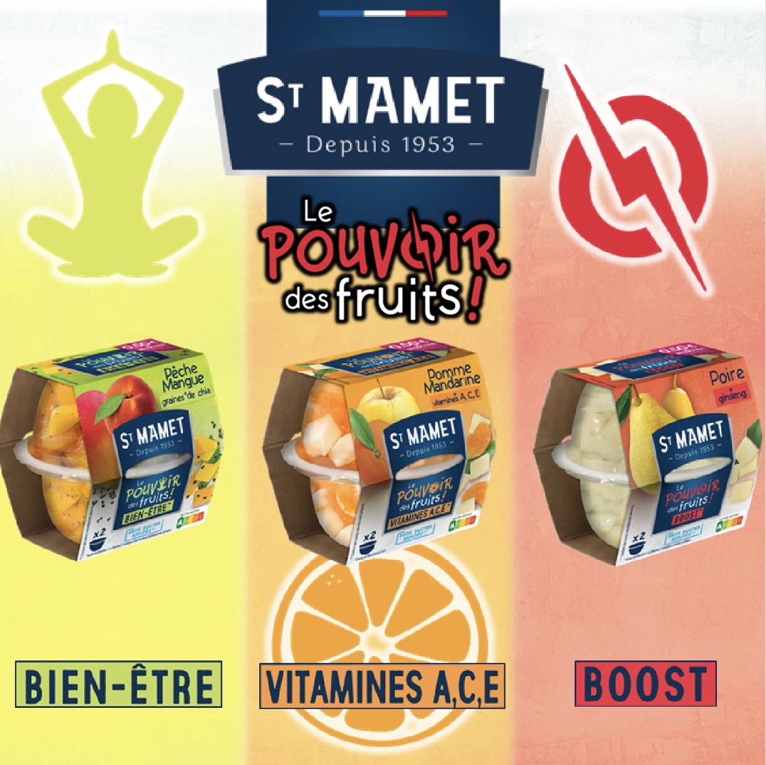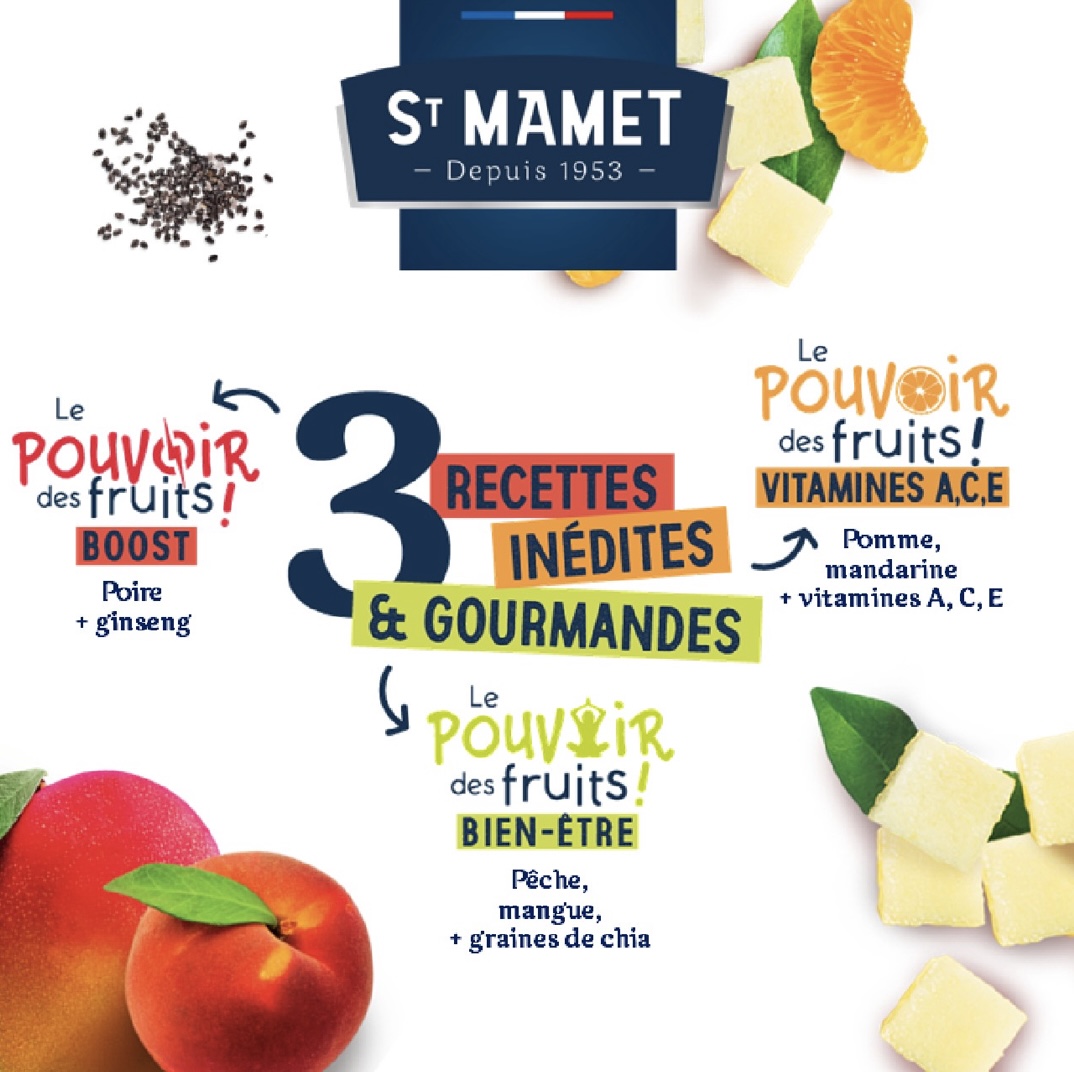 St Mamet propose une nouvelle gamme nommée « Le pouvoir des fruits » avec trois recettes gourmandes composées de mélanges inédits de fruits et superaliments dans le but d’offrir de super pouvoirs aux consommateurs.