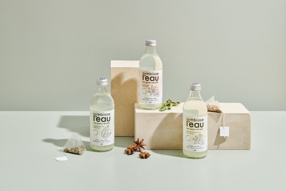 Symbiose produit ses eaux probiotiques en accord avec ce qui a fait le succès de sa première gamme de kéfirs de fruits lancée en 2020.