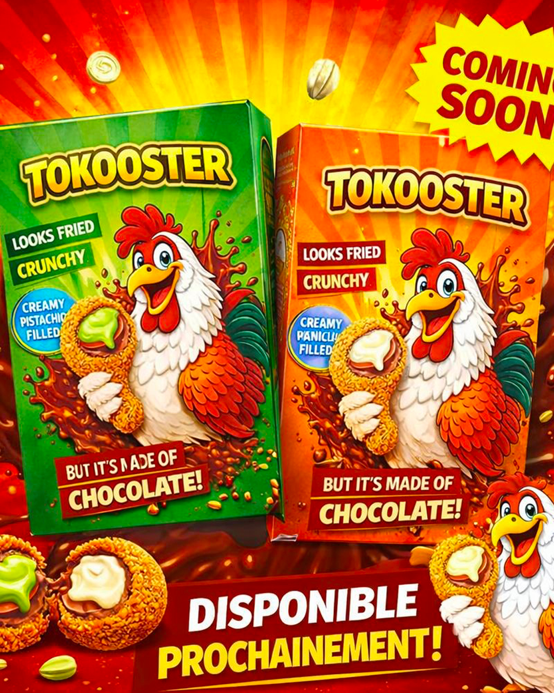 L’enrobage texturé imite à la perfection la panure d’un fried chicken, tandis que l’intérieur dévoile un cœur fondant à la pistache ou à la vanille.