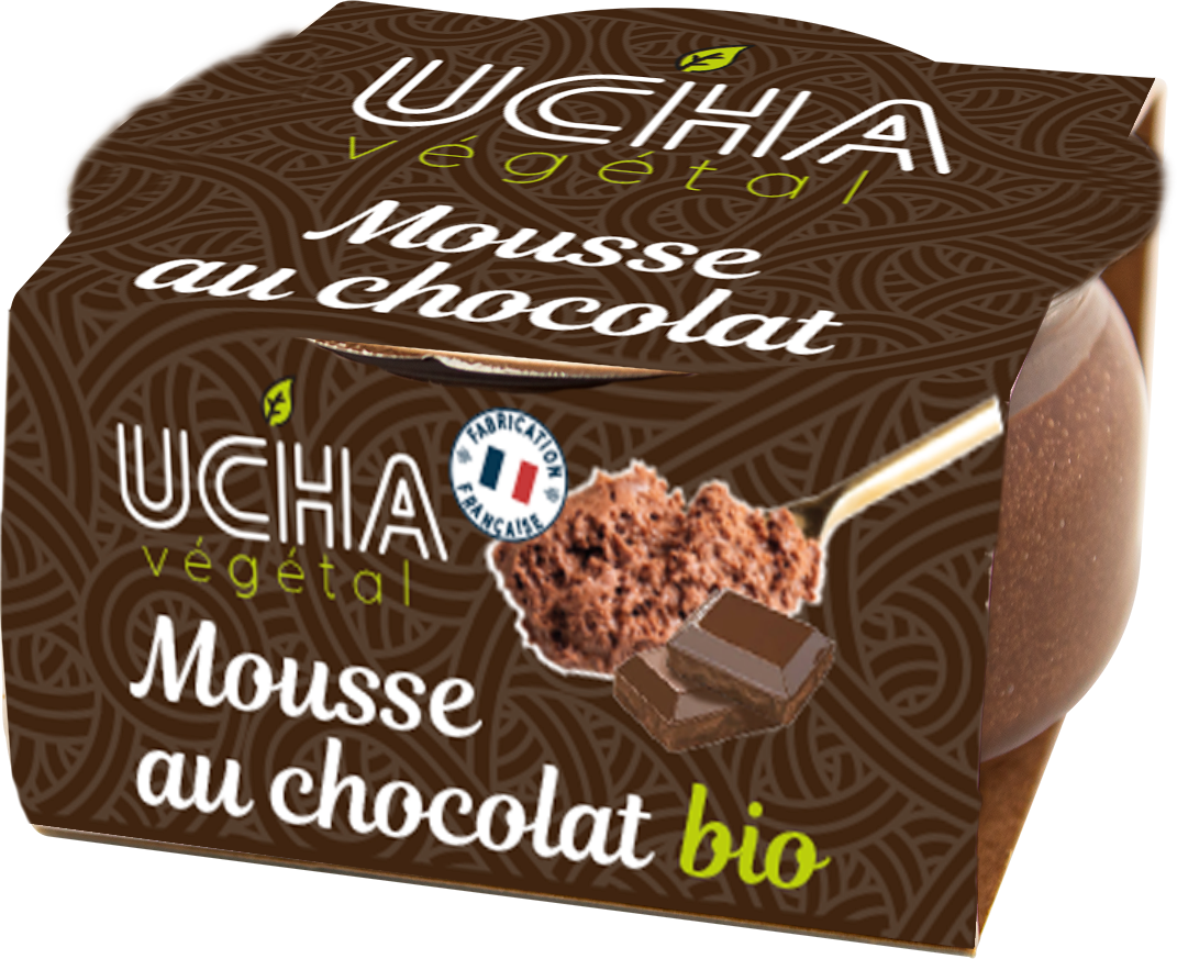 La marque propose des boissons et des desserts dont la mousse au chocolat végétale UCHA Végétal.