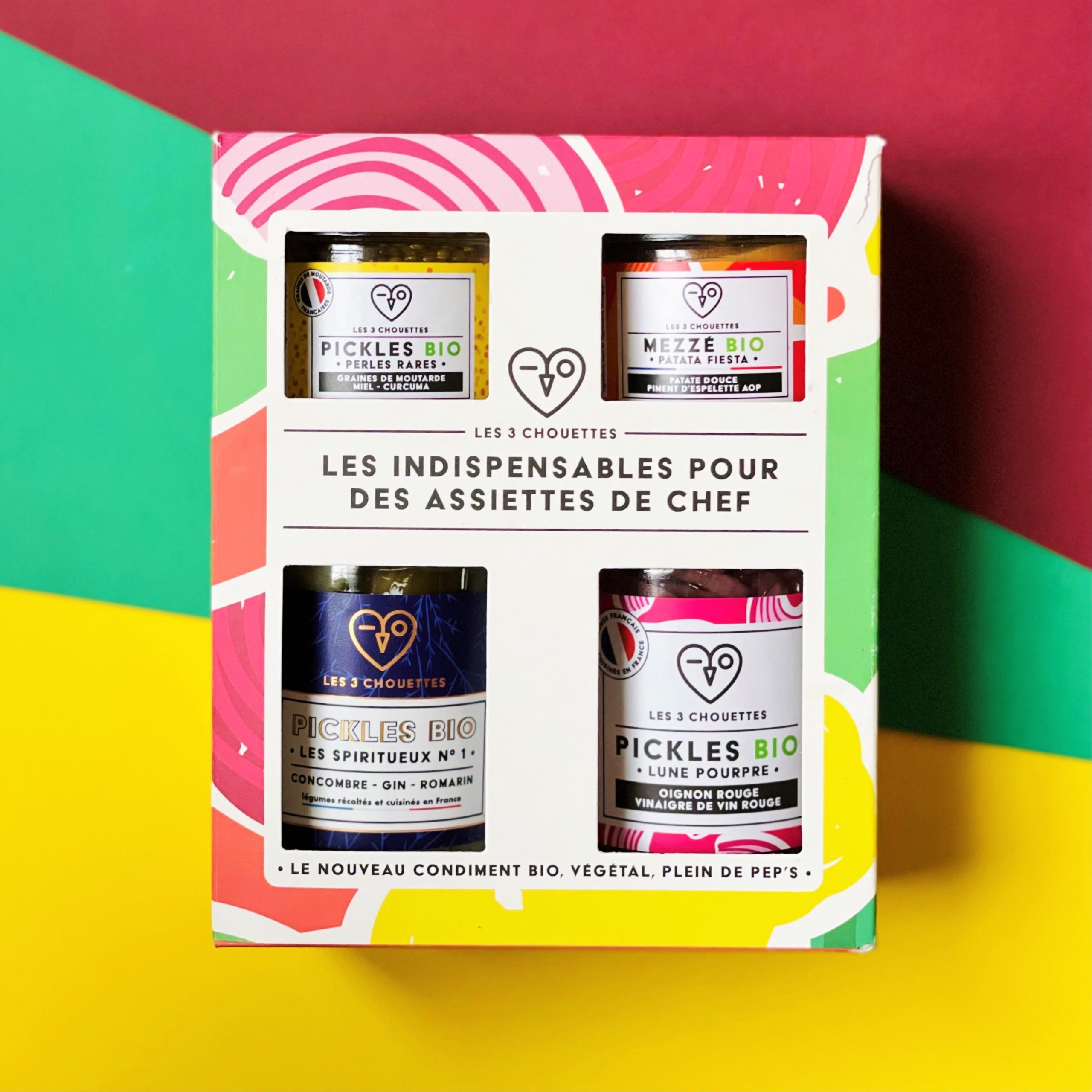 4 pickles ou mezzés à choisir librement parmi l’assortiment de la marque viendront se nicher dans un coffret coloré.