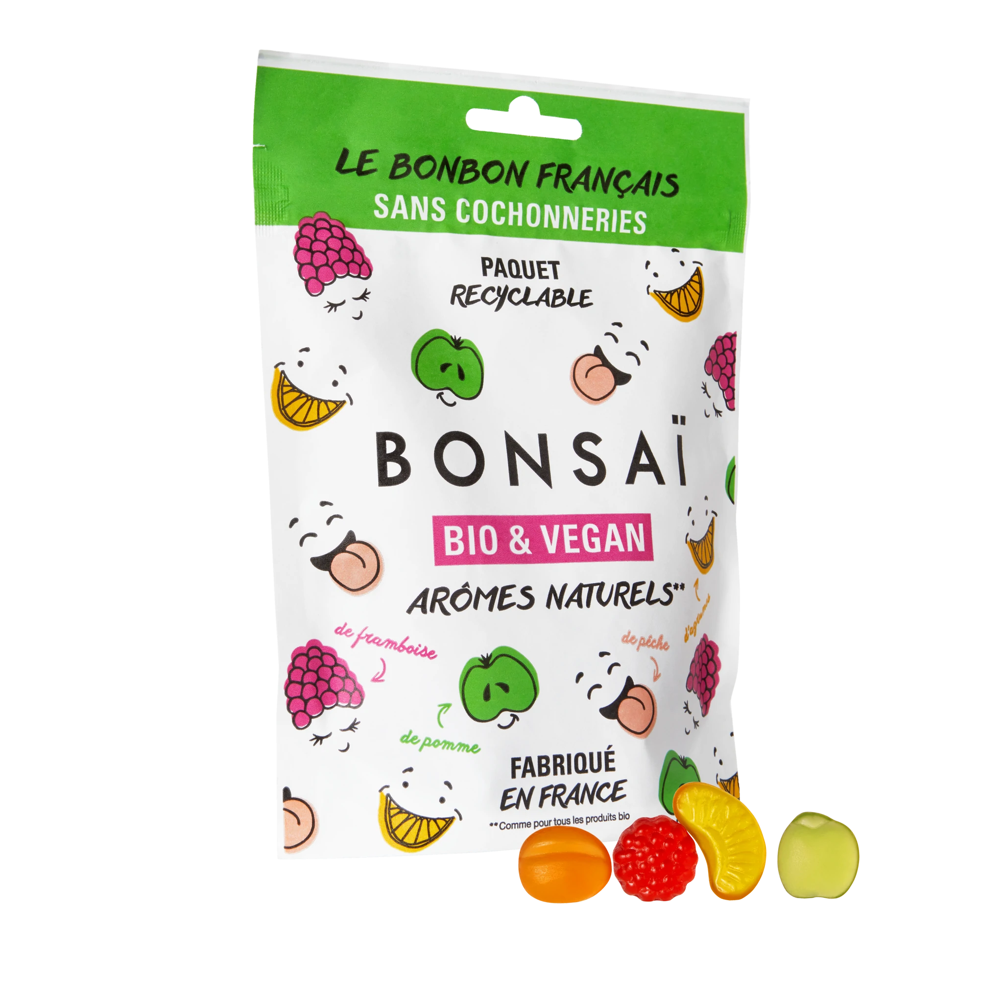 Les confiseries Bonsaï sont faites à partir d’ingrédients issus de l’agriculture biologique et fabriqués au sein d’une usine française. Finis les parfums artificiels ! Pour avoir un bon goût fruité, rien de mieux que de (vrais) arômes naturels ! Pour obtenir des friandises aussi gourmandes, Bonsaï utilise des arômes bio de pomme, de pêche, de framboise et d’agrumes. Les colorants sont eux aussi naturels. On retrouve notamment des concentrés végétaux tels que le cassis, le potiron ou encore la carotte, également issus de l’agriculture biologique. Conditionnés dans un paquet 100% recyclable, les bonbons Bonsaï sont à l’image de la marque et de ses petites mascottes : amusants, colorés et surtout écoresponsables !
