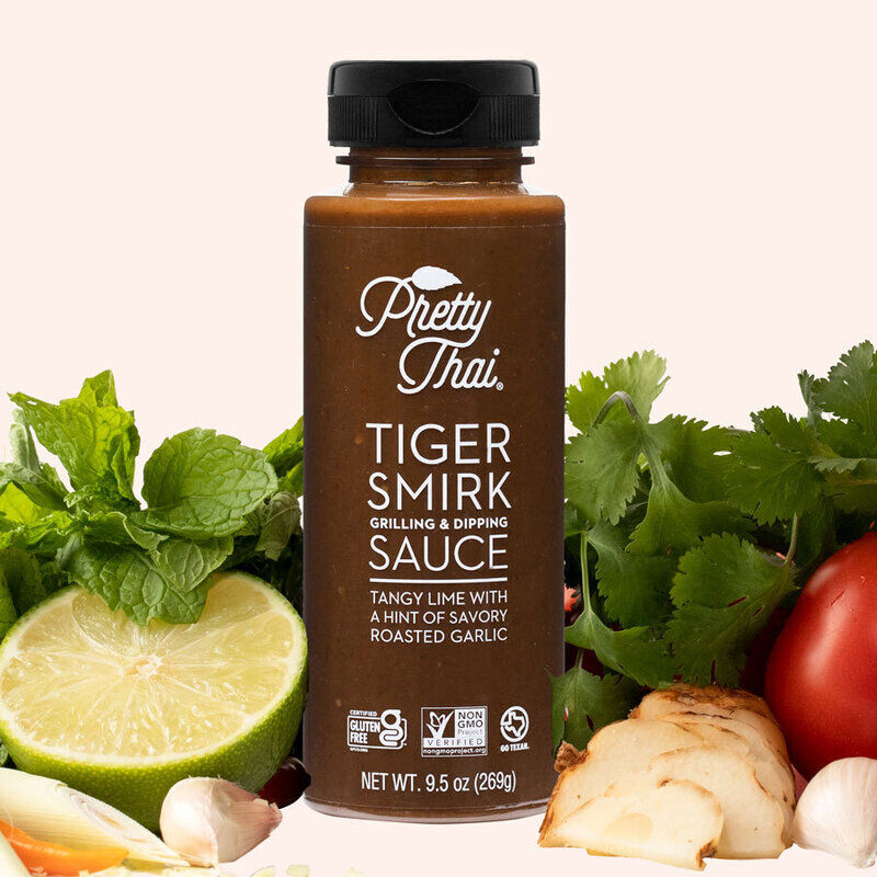 Tiger Smirk de Pretty Thai est une sauce polyvalente pour griller, tremper et faire sauter grâce à sa combinaison unique d’ingrédients piquants et salés. La sauce présente un accord improbable de concentré de jus de citron vert piquant, de sauce de poisson, de menthe verte, de coriandre, de citronnelle, de vinaigre, de sucre, de poudre d’oignon et de quelques autres ingrédients, ainsi qu’un soupçon de gingembre rôti.
