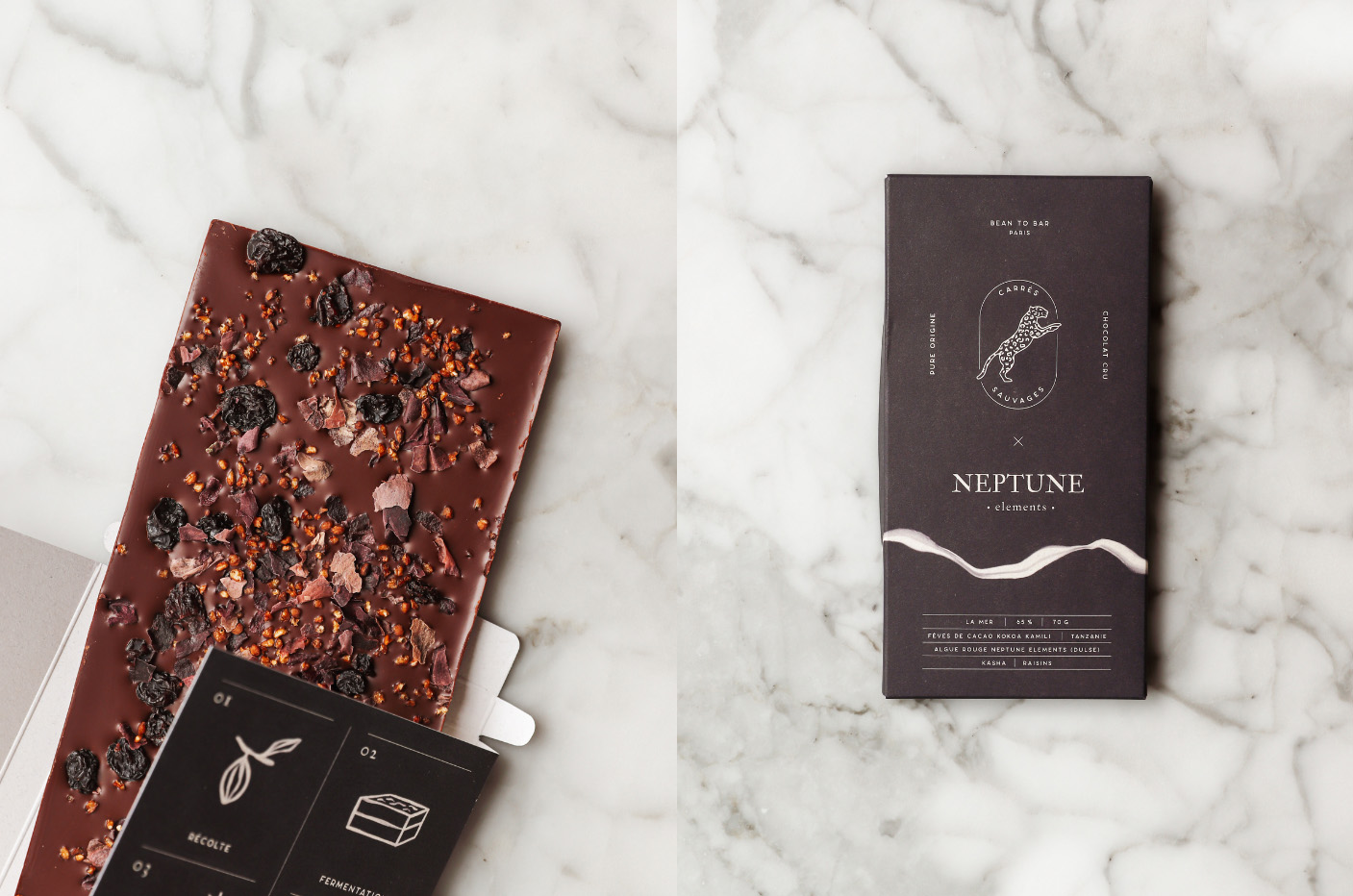 Mais ce n’est pas tout, avis aux amoureux du chocolat, Neptune Elements compte également surprendre avec sa toute dernière création : une tablette de chocolat aux algues baptisée La Mer . Inspirée de la mer, cette tablette de chocolat est née d’une collaboration avec Carrés Sauvages, la marque de chocolat cru et français d’exception. Les carrés de La Mer font voguer les papilles de plaisir en plaisir avec l’algue Palmaria Palmata, une algue rouge aux notes fumée et saline, riche en potassium, magnésium, protéines, iode et une excellente source de fibres, cultivée sur les côtes bretonnes en mer d’Iroise.